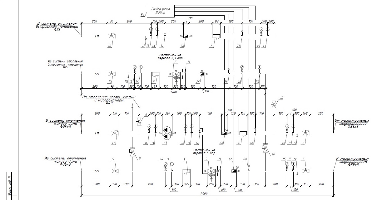 Объект жилой дом. 5 подъездов. Есть ИТП. В подвале на каждый подъезд в проекте показана принципиальная схема узлов регулирования системы отопления. (Файл)