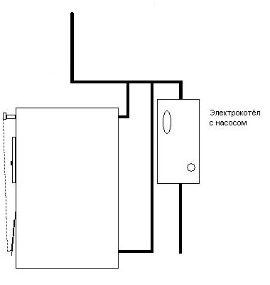 Если система грязная, то её надо промыть. Скат, это довольно дорогой котёл, хоть и Словацкий. В этом котле много лишнего. Систему надо закрывать. Автор. Автоматику переключения ставить не надо. Дон-16, это мало. Эти котлы под разные давления делались. Если у Вас к примеру старый КС-Т/ТГ-16Н, то он вообще на 1,2 кг. Не было сказано, снабжён ли Ваш котёл регулятором тяги. Для твердотопливника это важный элемент. Берущий на себя основную нагрузку твердотопливник, это всё равно что авто без руля, всё равно что парусник без мачт, это как... впрочем ладно Если нет регулятора, то надо снабдить. Всё что нужно электрокотлу, так это клеммы для выносного термостата. __________________________________ Ну и схема, собственно.
