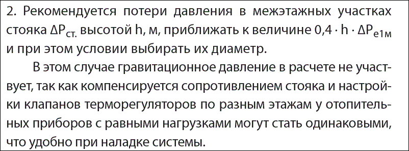 Системы отопления обычно рассчитывают с учетом 40% гравитационного давления, так как максимальное время отопительного периода оно именно такое. В этом случае гравитационное давление в расчете не участвует, так как компенсируется сопротивлением стояка и настройки клапанов терморегуляторов по разным этажам у отопительных приборов с равными нагрузками могут стать одинаковыми, что удобно при наладке системы.