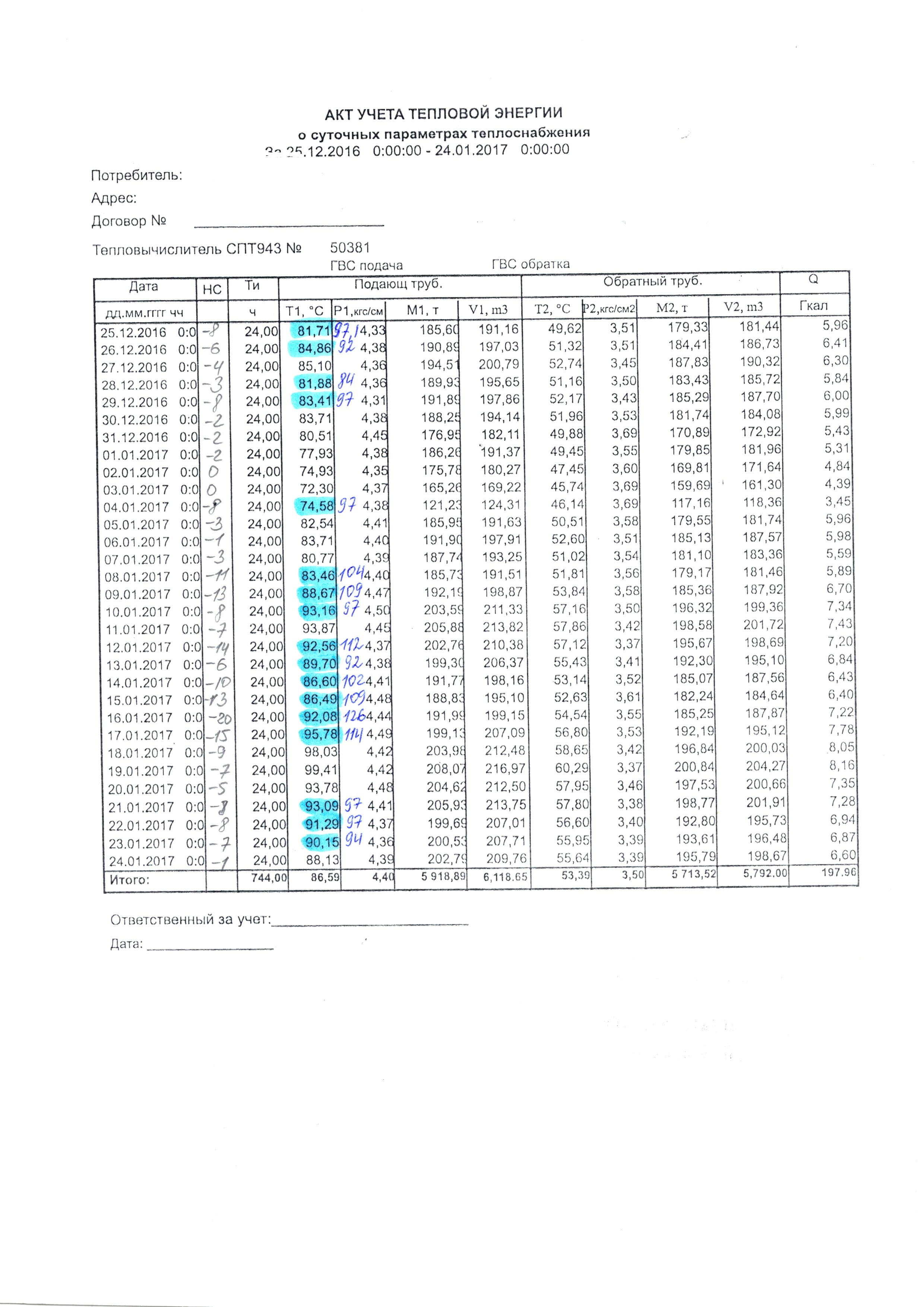 Цитата(borm @ 17.4.2017, 15:22)  Перепад у вас для элеватора маловат будет, он (элеватор) при таком перепаде работает обычно не очень хорошо, если вообще работает. А узел учета у вас стоит, расходы какие показывает? Нагрузку бы еще посмотреть. Распечатку показаний за январь, февраль выложить можете? Согласна. Это и пыталась доказать представителю теплоснабжающей организации (причем не я одна  ). Но представитель говорил,что элеватор работает нормально. Распечатку прилагаю. Взяла приблизительно одинаковый период до капремонта и после. Карандашом указана- среднесуточная температура, ручкой указаны параметры теплоносителя, которые должны подаваться по графику. Цитата(Inchin @ 17.4.2017, 14:31)  А как же быть с требованием СП, что в доме с элеватором запрещено применение ППр труб?