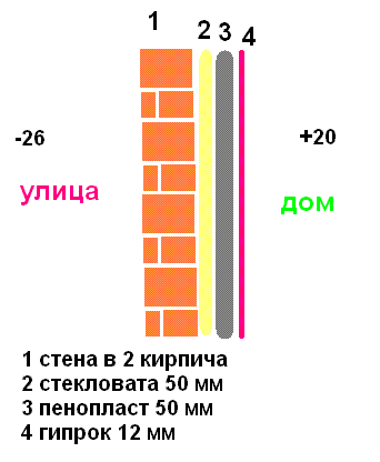 Ребята. О чем вы???? Снова спорите между собой. Только разругаетесь. Человек попросил совета и обоснования, почему он сделал не так? Смотрите на картинку!!!! Никакой пароизоляции нет!!! Стекловата прямо примыкает к кирпичу. Вопрос??? Чего будет??? Правильно... Отсыреет она и упадет как мокрое одеяло вниз, между кирпичом и пенопластом. Вот вам и точка росы, и мостики холода. А то как в вашей таблице или выписки из методической литературы, никто так делать не будет. Если только сами для себя... Утепление рационально только снаружи. Что снутри, то термос какой то получается. Не дай Бог жить в спертом воздухе и с плесенью.