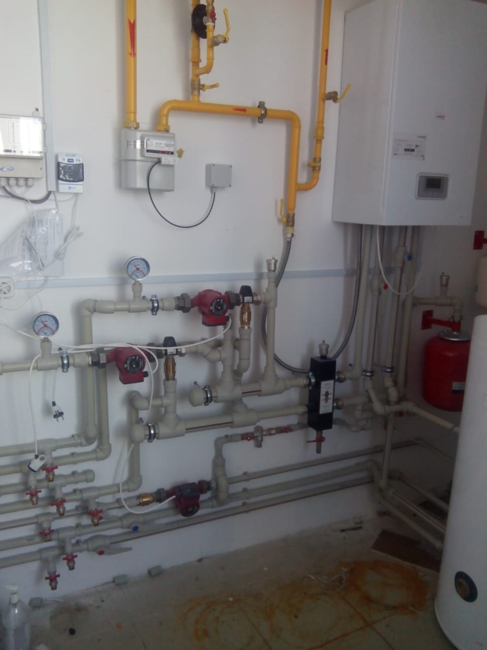 и вот получается, что труба после фильтра опускается вниз и идет до насоса. На фото с насосом это первая врезка. а от повысительного насоса еще две трубы идет. вот верхняя труба. она идет дальше на подпитку и тут же в бойлер. на фото с котлом видно, сначала ответвление в т2. а дальше прям в бойлер. бред какой-то