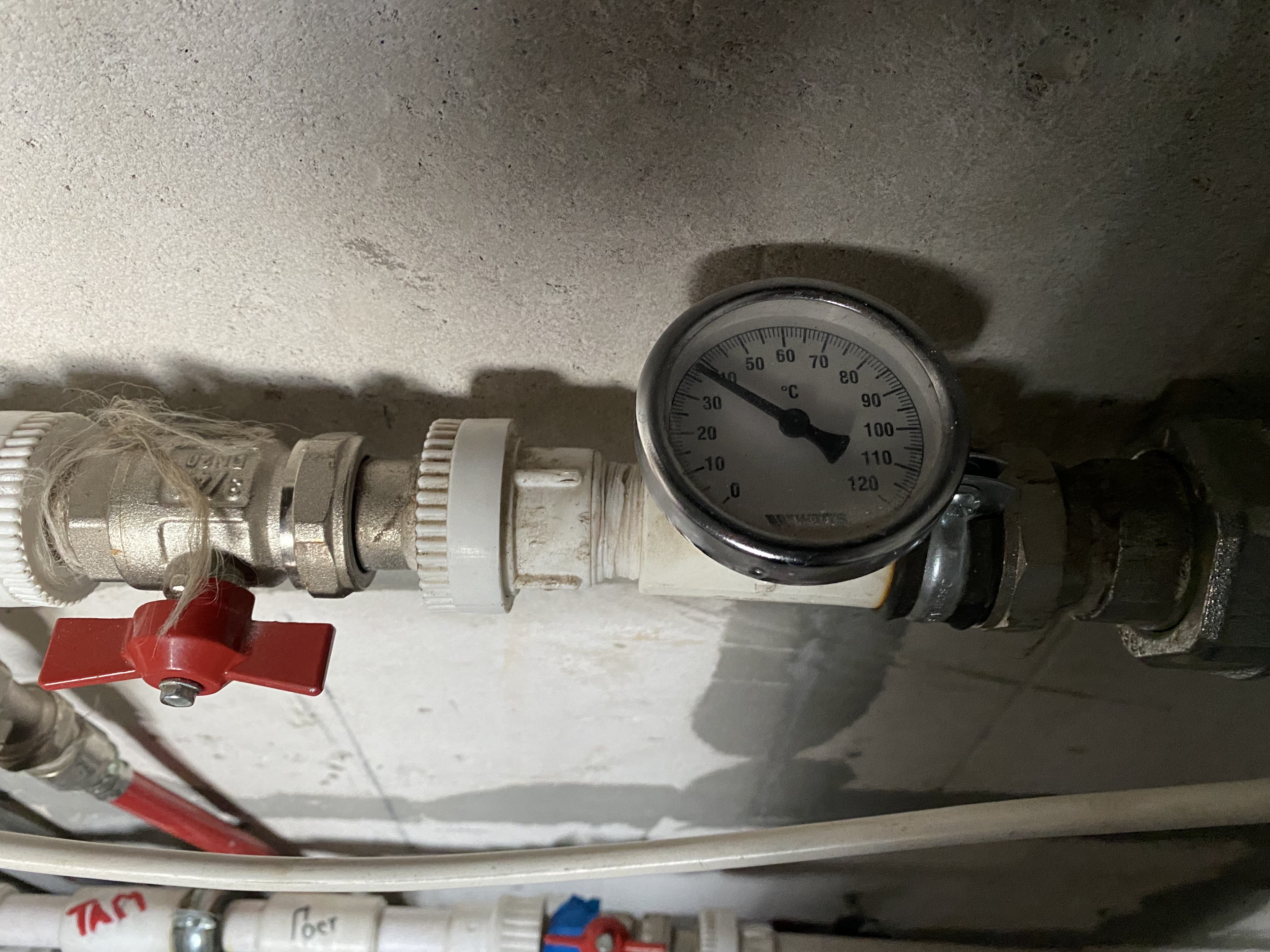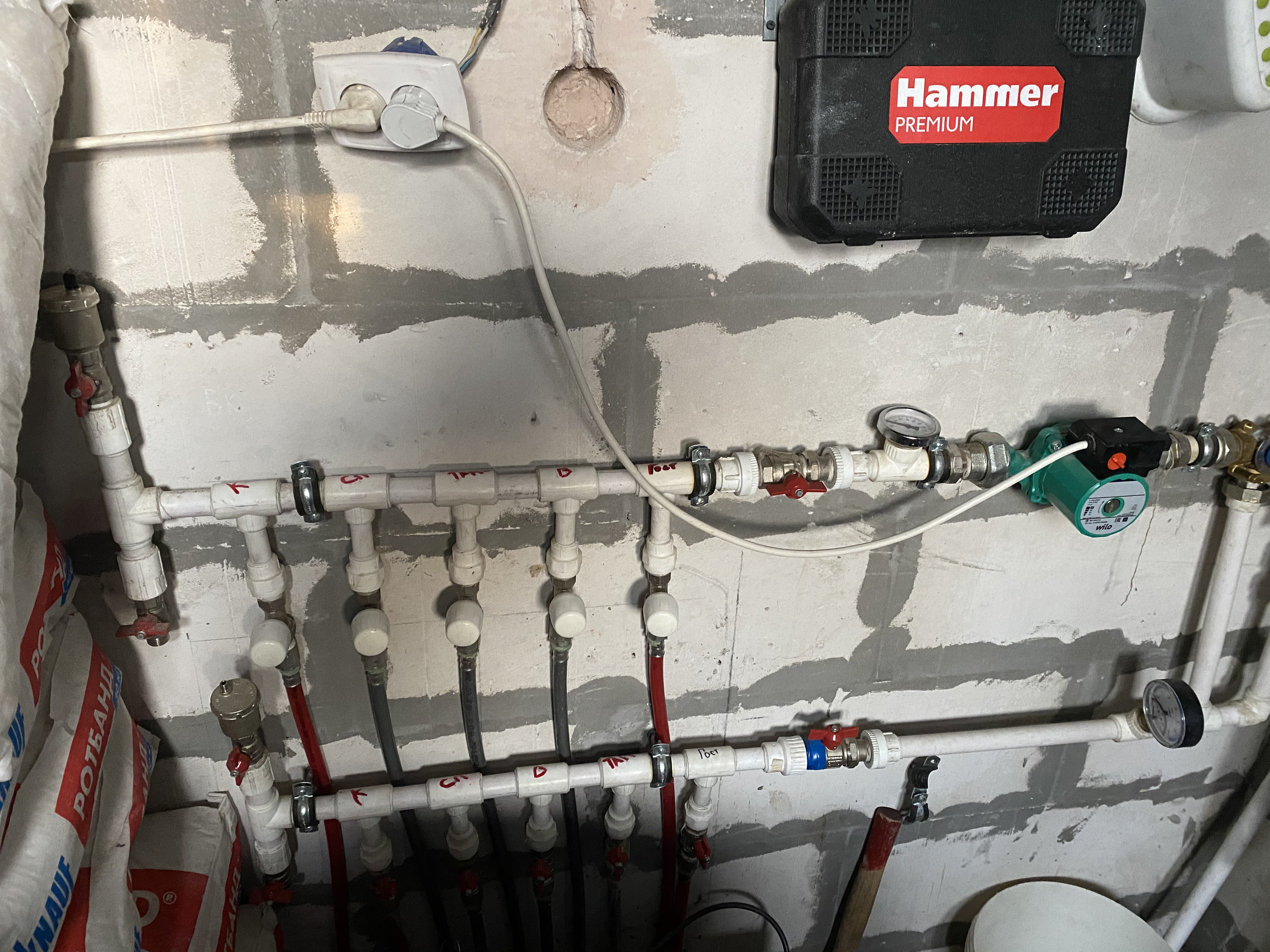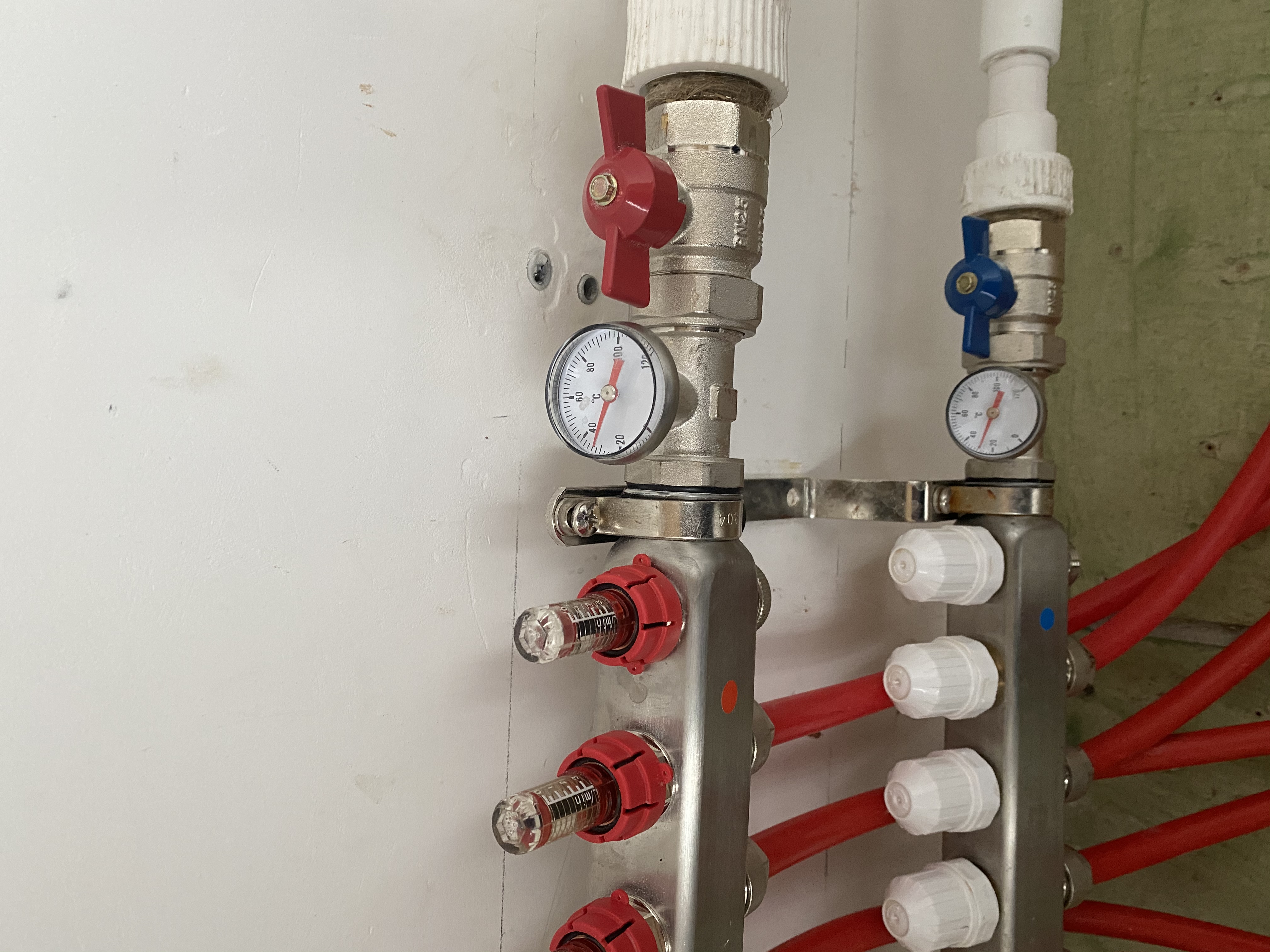 Не вижу перемычки с трехходовым краном на гребенке 2 этажа. Если она есть, то находится МЕЖДУ насосом и гребенкой 2 этажа, и если трехходовой полностью открыт на перемычку - насос гоняет теплоноситель через перемычку, и через пол 2 этажа циркуляция практически нулевая. П.С. это если фото сделано при работающем 2 этаже, то есть при его работе подача и обратка на гребенке одинаковые, около 30 градусов. Вариант 2 - не очень хорошо видно, что под колпачками обратки на гребенке 2 этажа. Если там термостатические клапана, то закрученные до упора колпачки просто перекрыли поток теплоносителя по веткам. При включении 2 этажа расходомеры на гребенке как-то реагируют?