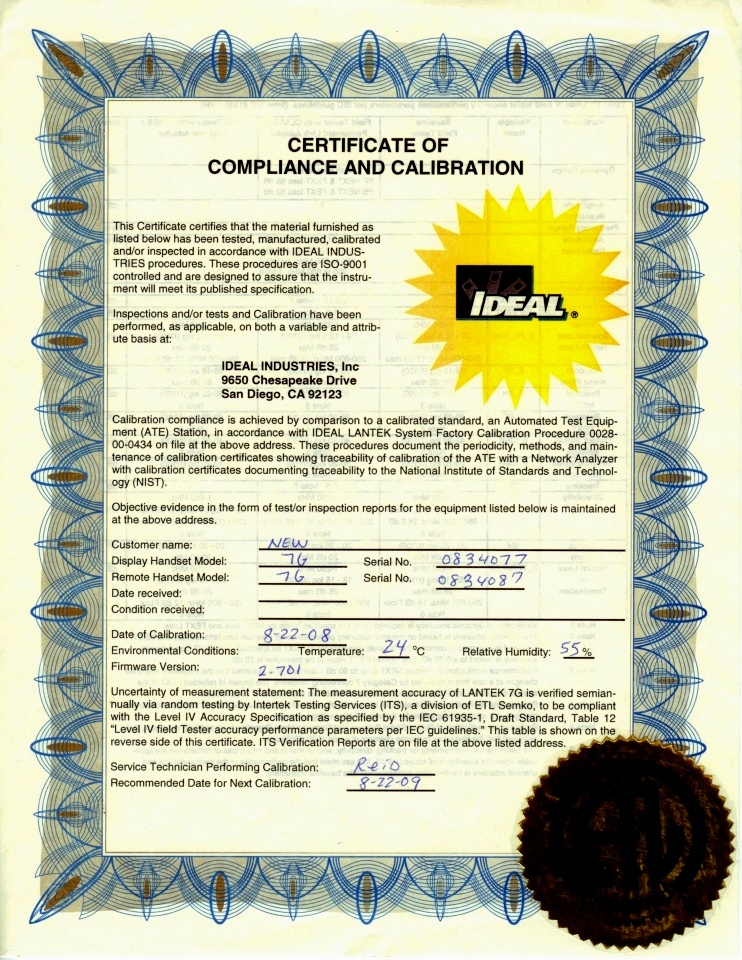 Сертифицированный тестер - анализатор СКС "LANTEK 7G Premium". Trade-Up to LANTEK 7G 1 GHz LAN Cable Certifier Premium Version. Заводской номер основного блока-дисплея 0834077. Заводской номер удаленного блока-дисплея 0834087. Дата изготовления 22 августа 2008 года. Версия программного обеспечения 2-701. Комплектность поставки Комплект LANTEK 7G состоит из головного устройства с дисплеем (поставляется с ярким цветным экраном 1/4 VGA) и удаленного прибора. Удаленный прибор для удобства связи с головным прибором оснащен черно-белым ЖК-дисплеем на две строки. LANTEK 7G, кроме стандартных USB-портов, оборудован двумя полнофункциональными разъемами PCMCIA, предназначенными для подключения компактных флэш-карт и расширения возможностей прибора в будущем. В комплекте с прибором поставляется программа для персонального компьютера LANTEK Reporter, которая может загрузить сохраненные результаты измерений с последовательного порта, порта USB или с компактной карты флэш-памяти и создать краткие суммарные или подробные протоколы паспортизации для конечного заказчика. Преимущества комплектации Premium: • два дополнительных аккумулятора и внешнее двухслотовое зарядное устройство к ним - значительно увеличивается время автономной работы тестера • дополнительная съемная карта памяти на 64 Mb и внешнее считывающее устройство к ней - возможность сохранения большего числа результатов измерений и более простой перенос их на компьютер для дальнейшей обработки • жесткий алюминиевый бокс - гарантия сохранности устройства во время транспортировки Цена 120000 рублей. |