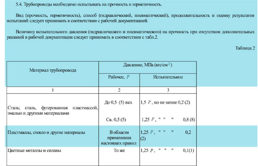 пункт 5,4 Величину испытательного давления (гидравлического и пневматического) на прочность при отсутствии дополнительных указаний в рабочей документации следует принимать в соответствии с табл. 2.