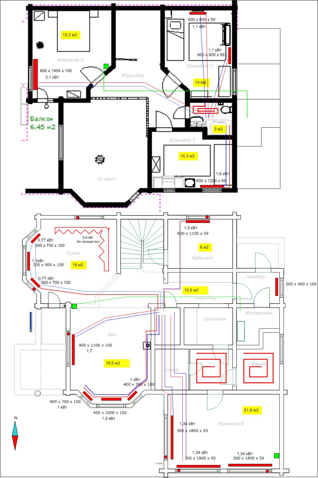 Вы правильно решили применить коллекторную систему, но неправильно поняли как она делается. 1. Коллекторный ящик не стоит располагать в ванной комнате т.к. там гидроизоляция и греющие полы. 2. Трубы подключения не прокладываются через стены - только через проёмы (дверные). Незначительная усадка стены может повредить трубы. А усадка первый год будет обязательно. 3. На малых площадях (до 12м2) ванных и туалетов тёплые полы можно подключить к обычному отоплению со специальным термостатным ограничителем температуры ( у Данфосс это FJWR) - есть и других фирм. Также готовые блоки с регулировкой для таких полов. 4. Коллекторные ящики лучше всего расположить в коридорах в центре дома чтоб расстояния до радиаторов в разные стороны были бы примерно похожими. Система с двумя котлами 1 - электро; 2- Газовый - "Турбо" исполнения без трубы как резерв, или наоборот, впишуться в вашу котельную. Надо выбрать котлы и под них делать схему котельной Что-то увидел ваш регион и мощности приборов - кажется, на первый взгляд, маловато