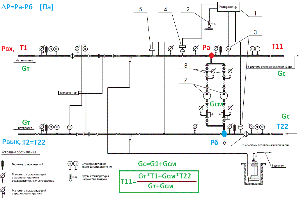 Как производится управление? Если Вашим жильцам стало жарко, они прикроют термостаты на батареях. Как следствие, вода в радиаторы не попадет, и температура обратки Т22 вырастет. Поскольку именно эта обратка частично закачивается (подмешивается подмешивающим насосом, см. гидр. Схему) в подачу, то рост Т22 вызовет при постоянстве расходов Gт и Gсм соответствующий рост Т11 (см. формулу).