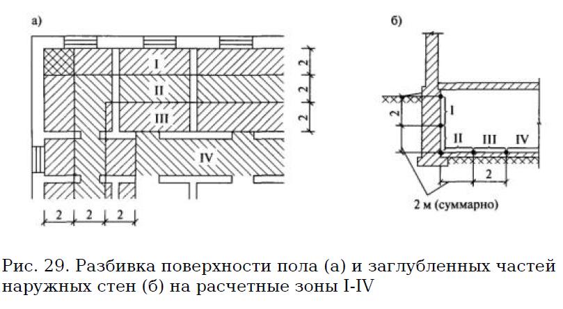 Коллеги! нужна помощь! Подскажите как подсчитать приведенное сопротивление теплопередачи наружных ограждающих конструкций подвального помещения, контактирующих с грунтом. Знаю, что необходимо площади подвала разбивать по зонам, почитал приложение Я.2 СП 23-101-2004г Проектирование тепловой защиты здания, ничего не понял!  Может есть какая-то более подробная методика, помогите! В моем случае, все банальней, есть МОУСОШ (средняя школа) и есть подвальное помещение, размеры подвала (ширина, длина, высота, площадь, объем) известны. HELP!