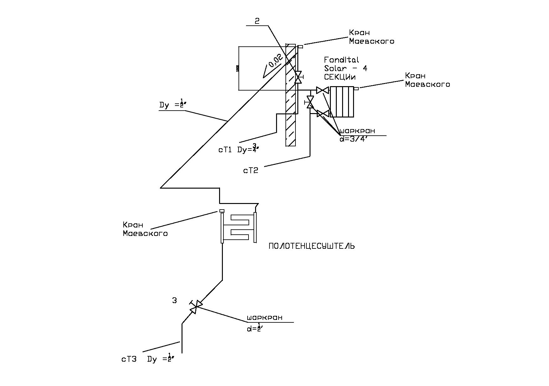 Цитата(Lyko @ 20.10.2011, 0:42)  Закрыв краны 2 и 3 проверьте (открывая кран 3,...2) линию между ними, по участкам - кран 3- до П/С, сам П/С и линию от П/С до крана 2. Если труба ПП - запайка стыка (?) (..Если ваш сантехник почему-то это еще не сделал.) Дело в том что труба паялась без подсоединения к крану 3 ( в этот момент кран 3 и 2 были закрыты и участка между ними не было установлено) и вертикальному участку возле батареи. Как только все это спаялось и установилось в кран 3 через муфту МРВ был открыт кран 3 и проверен выход воды, до подсоединения сушки. Давления в стояке после крана 3 почему то не было.  Сорри за рисунок - не повернут на 90 град.