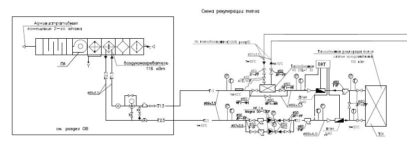 Согласно идее БРТО используется как конденсатор для холодильный централей и питает приточку. Тут же запроектирована система "догрева" воды БРТО от ИТП. Система создана для отопление в переходные периоды года. К слову сказать непонятно что догревать, если рабочие параметры приточки и БРТО идентичны, но это решение проектировщиков.