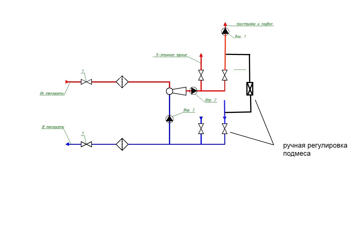 Попытки "приделать" к этой системе насосы - вынужденные, связанные с неким "фактором" нехватки давления/расхода. Этим фактором, имхо, явл. дополнительная ветка с Ду15 разводки. "Созданная", видимо, заново. С диаметром, предусматривающим насос. Видимо, ее создатели никак не ожидали, что элеваторный узел - НЕ НАСОС. И нужного перепада давлений не создаст. Поэтому предложенный "подмес" - вариант "приколхозить" насос к такой (элеваторной) системе. С наименьшим (возможным) ущербом, но с выполнением задачи. И Никакой необходимости "колхозить" насосом еще и 5-этажку не вижу (жалоб нет).  Если "проблемная" ветка посажена на "старые" (проектные) врезки, расход на нее ДОЛЖЕН быть предусмотрен проектом "..из условия обеспечения распределения тепла в соответствии с тепл. нагрузок и гидр сопротивления".