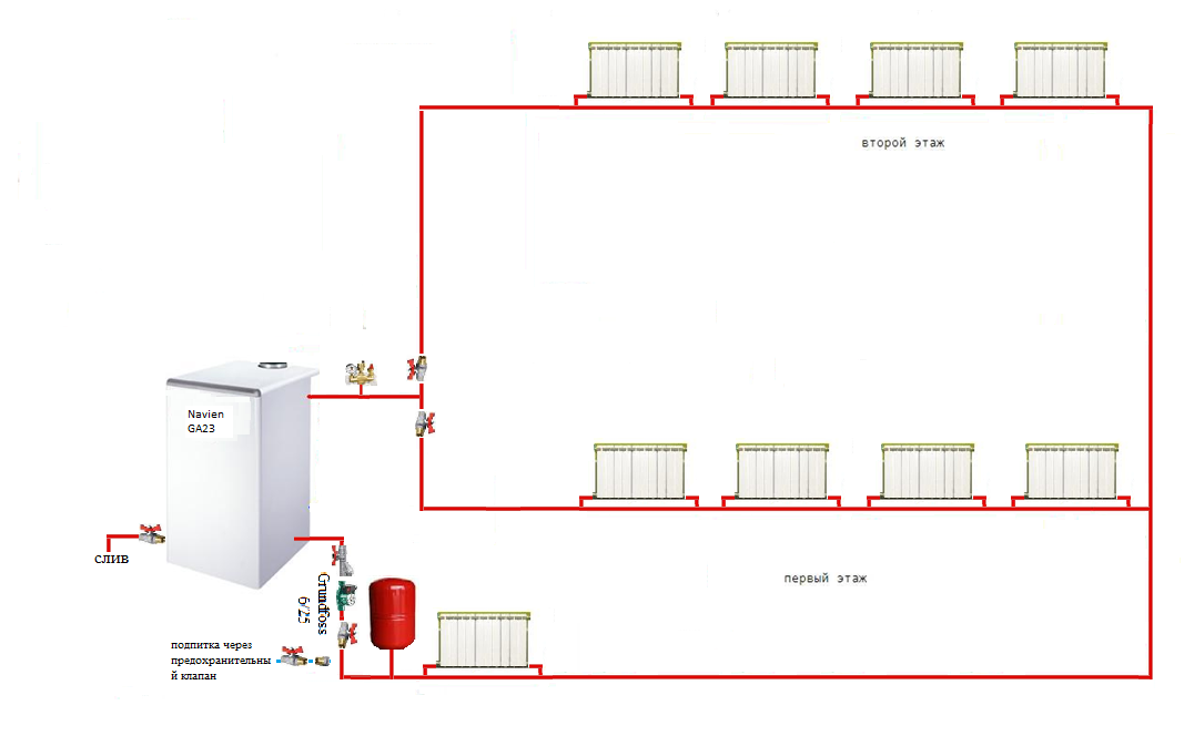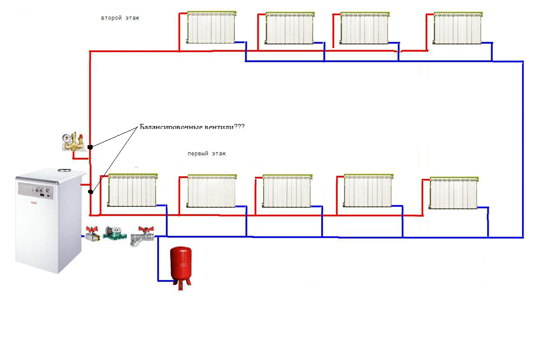 И второй вопрос: ставится "узел" (ручной балансировочный вентиль, кран шаровой, сбросник) перед точками разветвления системы отопления, и дублируется на обеих линиях после них - не логичнее ли будет ставить балансировочный на каждый стояк? Особенно интересно на той линии, к которой подключаются стояки с разными системами - а балансируется она в самом начале...