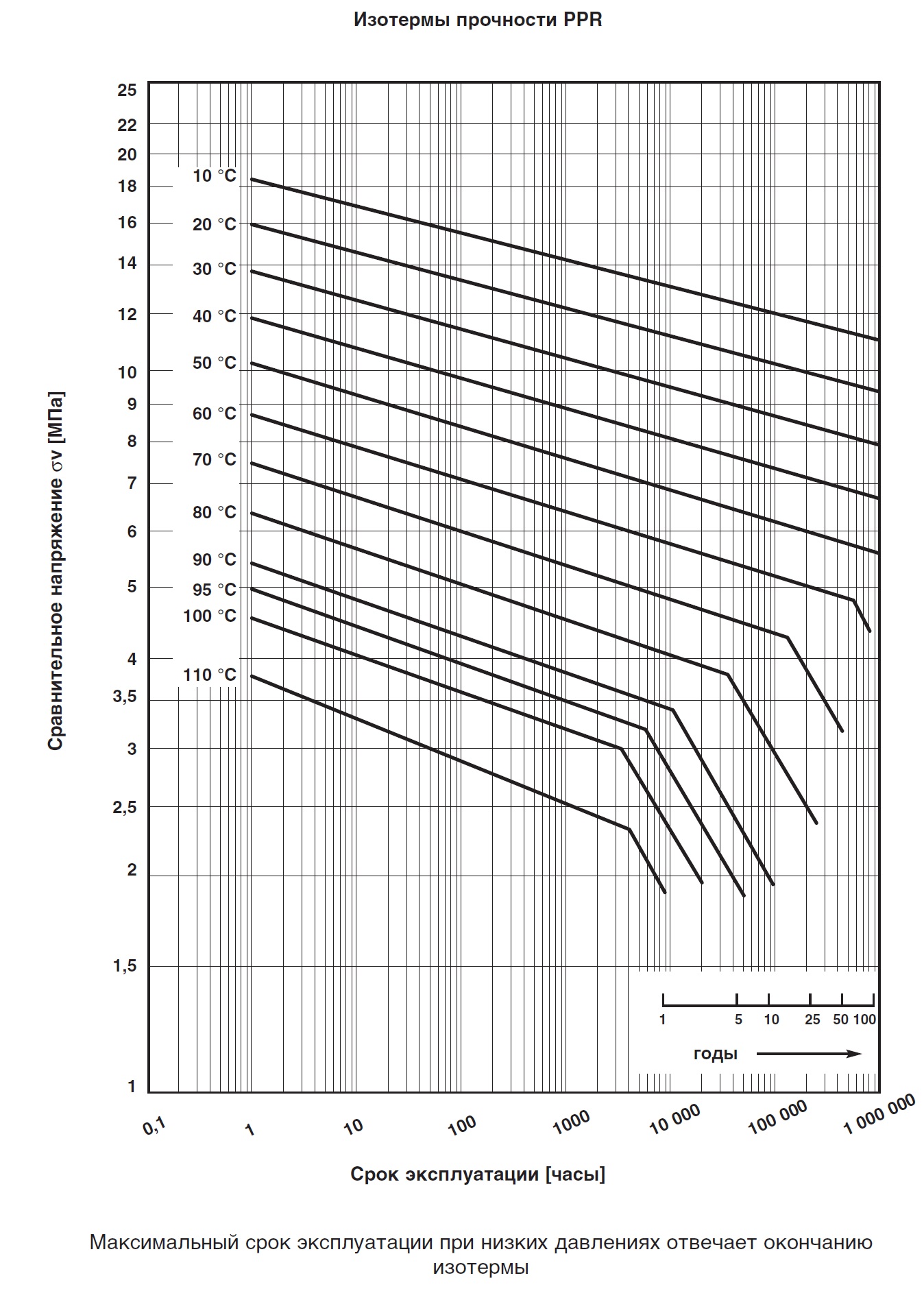 Во вложении часть таблицы от технического руководства для труб Heisskraft. Там для PPR-3 при к-те запаса 1.5 труба SDR 6 под давлением 4.3 бар и температуре 110 град. Цельсия должна простоять год без разрушения. То же самое оговаривает ГОСТ Р 53630-2009 "Трубы напорные многослойные для систем водоснабжения и отопления. Общие технические условия " - для PPR3 - при испытаниях на термическую стабильность при температуре 110 и при начальном напряжении в стенке 1.9 МПа, что соответствует для труб SDR 6 (серия 2.5) допустимому рабочему давлению без учета запаса прочности 7.6 атм., должны не разрушаться год. Т.е. в принципе нормально - 110 бывает нечасто, давление 4 атм. - обычное для 5-ти этажного дома. С учетом длительности отопительного сезона и динамики температурного режима лет 10 может простоять. Вопрос в другом: Почему несмотря на официальные запреты и оговорки производителей фактически идет повальное применение ППР труб в ЦО, причем, в том числе, с подачи специалистов (инженеров) по отоплению ? Не будем брать во внимание грубые механические воздействия на трубы и некачественную пайку.