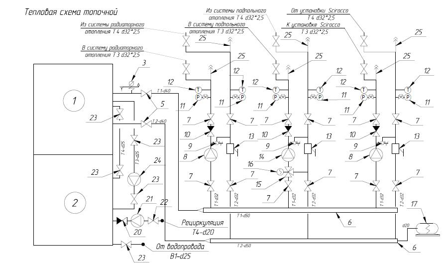 И еще на схеме обычно показывается минимум по автоматизации, то-есть места расположения датчиков температур и чем управляет контроллер. (если он есть)