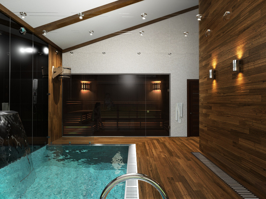 Всем привет! Дали делать объект по отоплению. Отдельно стоящее здание с бассейном, сауной и бильярдной. Есть проблема с бассейном.С одной из сторон бассейна чаша вплотную примыкает к наружной стене. Как решить вопрос с отоплением сего дела? Одна стена витражная, там ставлю внутрипольные конвектора. А вторая обычная, из пеноблока, но судя по решению дизайнеров будет стеклянной. У меня в голове 2 варианта: 1) Либо заменять материал внутренней облицовки со стекла, на что то другое, и ставить настенные приборы, протащив трубы в штробах в стене. 2) Либо использовать воздушное отопление, обдувая эту стену вентиляцией. Прошу совета у метров. Прилагаю картинки визуализации и план здания.