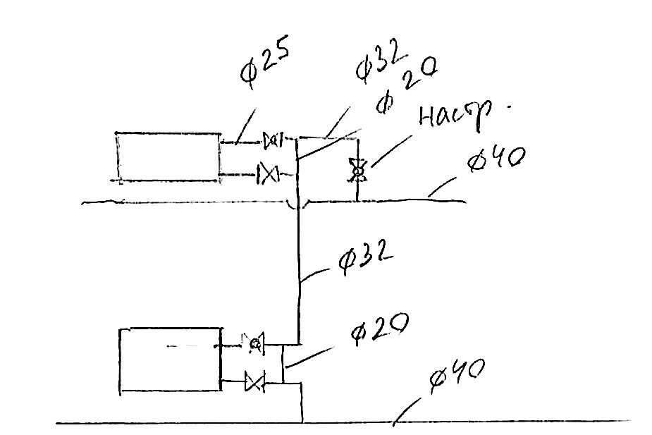 Цитата(Wiz @ 18.7.2016, 15:26)  где ж там 9 м то ? 31-30=1 м! Надо же было так смешно ошибиться! Извиняюсь! При таком располагаемом напоре, видимо нужно делать уже почти гравитационку (ЕЦ). И вероятно с верхним розливом. И с двумя или четырьмя контурами (ветками). Такая система и напор не требует и самобалансируется по кольцам. Типа такой -