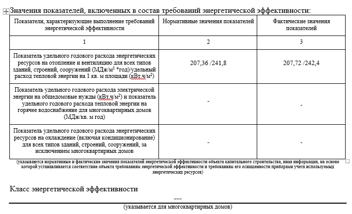 Значения показателей, включенных в состав требований энергетической эффективности: