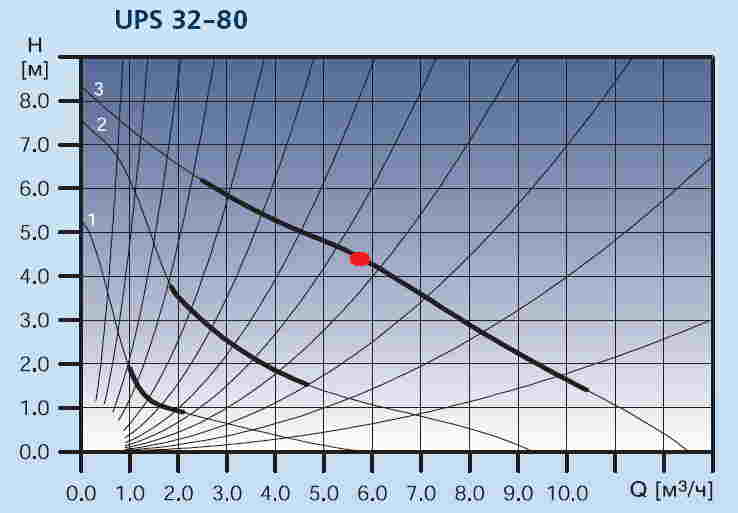 Цитата(HeatServ @ 29.6.2009, 16:54) [snapback]405110[/snapback] На какой скорости гоняли насос? Если на 3-ей, то очень даже подходящий насос, даже сдросселировать можно, но это уже при окончательной наладке, в том плане, что на расчётной точке по производительности (8,8-3,2=5,6 т/ч) он выдаёт напор в 4,5 м.вод.ст. (см. рисунок), правда чем-нибудь его придётся подзажать на напорной стороне, если вдруг потери в системе действительно невелики (не больше 1,5-2 м.вод.ст., в чём я лично сомневаюсь). Пока не поздно, исправляю сам себя. Расчётный коэффициент смешения при 130/70 сети и 105/70 системы - 0,71. То есть из сети поступает 5,1 т/ч (автор правильно указал) а насос должен дать остальные 3,7 т/ч, при этом оптимальная скорость насоса 32-80 при сопротивлении системы 1,5-2 м.вод.ст. - вторая. А если насос гоняли на 3-ей скорости да еще и полностью открывали поворотный затвор, то и возникал тот самый шум по стоякам, поскольку в системе ходило воды почти в два раза больше расчётного. Всё, спать...