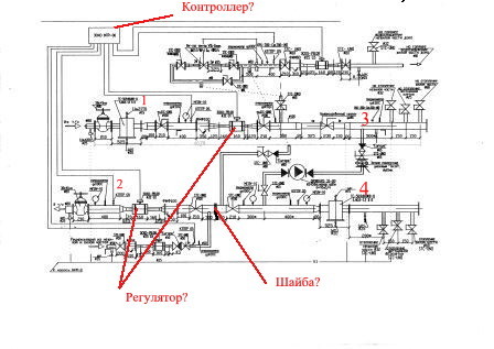 Цитата(HeatServ @ 30.6.2009, 2:28) [snapback]405153[/snapback] Присмотрелся к приложенному рисунку. Эта схема так и выполнена как нарисовано? На обратке и подаче однородные регуляторы стоят? Принцип действия регулятора на обратном трубопроводе непонятен, вроде должен по давлению работать, но датчика давления не нашёл. Сверху контроллер? Что за модель? Еще раз уточните какие располагаемые перепады (ранее вы указывали 0,4 кг/см2 или 4 м.вод.ст.) и в каких точках замеряли P1 и P2, для удобства схему пронумеровал (1-4). На обратке шайба нарисована, есть ли она по факту и если есть, то какой диаметр? То что вы приняли за регуляторы, на самом деле расходомеры. А "контроллер" - это теплосчётчик.