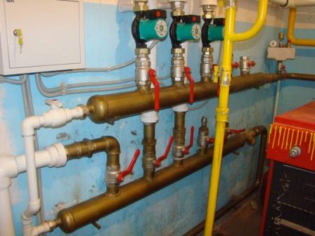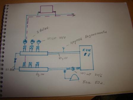 Предложенная СО сделана, по всей вероятности, наспех.. насосы без отсекающих кранов на случай ремонта, фильтр без обводной линии на случай прочистки.. без обратных клапанов. Защитой от кавитации никто не заморачивался. Тот же фильтр грубой очистки способен "насмерть" прекратить какую-либо работу СО, забившись грязью. Если линия подпитки подключена к коллектору подачи, тогда можно и надеяться ..на давление водопровода. И компенсацию им "вакуума". Очень похоже на правду.При уменьшении производительности насосов шумы в них стихают.Отсекающие краны есть(их не видно на фото).Фильтр без обводной  Обратные клапана на ветки в принципе не так и нужны,лишнее сопротивление.Линия подпитки подключена в подачу.Но даже если поможет ....это полумера.....Подпор коллектора обратки налицо.Гидравлический распределитель до коллекторов пожалуй поможет.Перепад давления уйдет.Из сотки наверно хватит ?В дальнейшем в коллектор будут подсоединены возможно ещё две ветки с подобными насосами.Хватит ли диаметра коллектора в дальнейшем для обеспечения нормального расхода.И не потребует ли замены насос первичного контура........ Да и большое спасибо за отклики....Да и ещё вопрос "не имело-ли большую целесообразность использование однотрубной системы при монтаже веток....