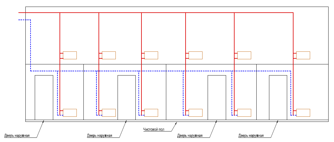 Была чем-то схожая ситуация. 4-ох этажное здание. Причем 4-ый этаж планировалось в дальнейшем только надстраивать. Так что разводить пришлось под потолком 1-ого этажа. Все делалось в эконом варианте, без регулировки. Приборы РБС кроме 1-ого этажа, там регистры. Схему прикладываю.