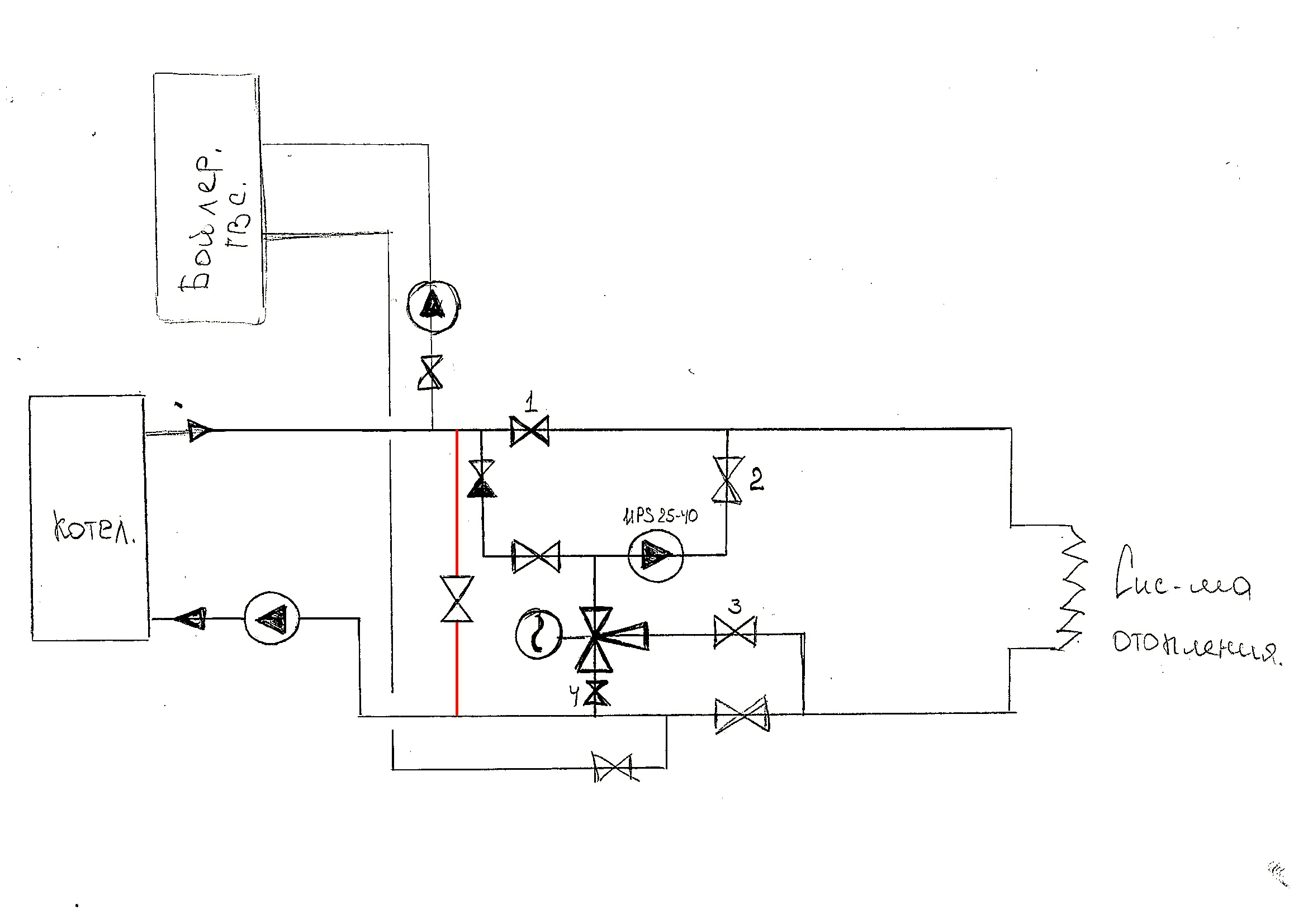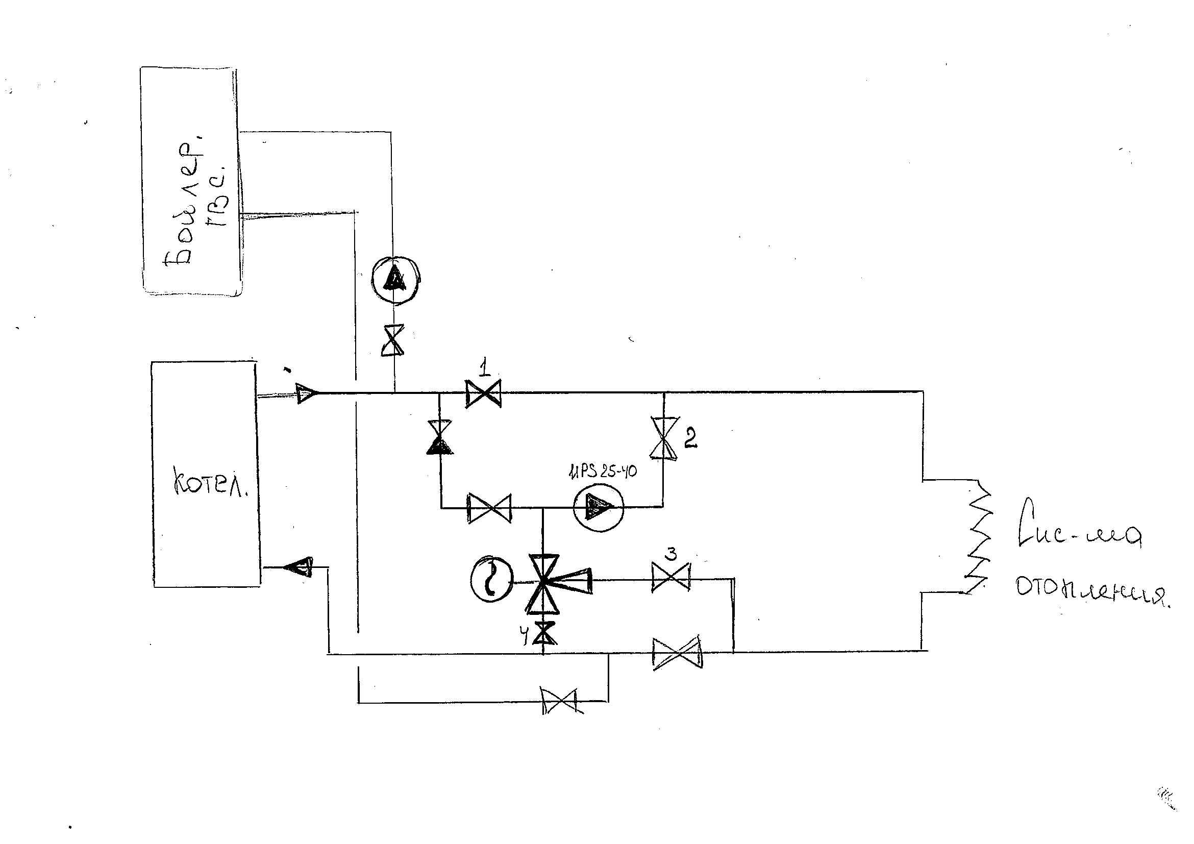 в режиме ЕЦ - закрывать 2 и 3 и открывать 1 и 1' (естественная) в режиме ПЦ - открывать 2 и 3 и закрывать 1 и 1' (принудительная) ПС. И еще - если "современный газовый" при отсутствии электричества не работает - тогда вся эта паукообразная мутотень с естественной цируляцией становится не нужна, и её предлагаю вырезать, оставить три крана, клапан и насос, бак поставить мембранный и залить антифриз.