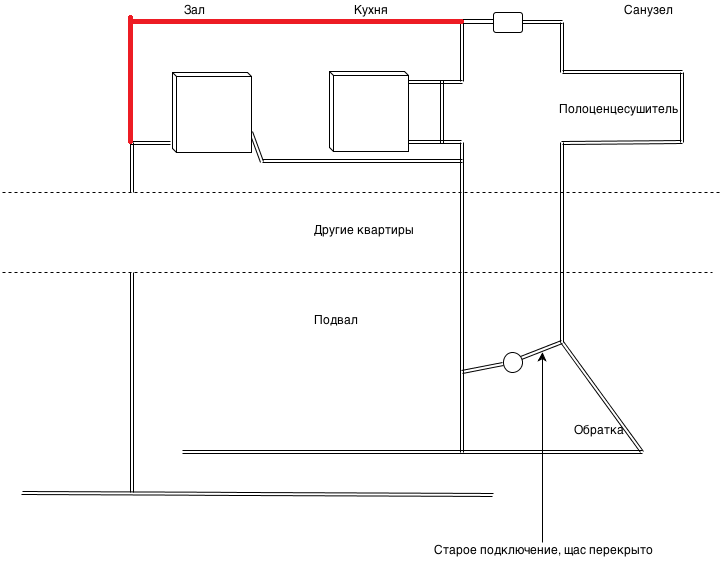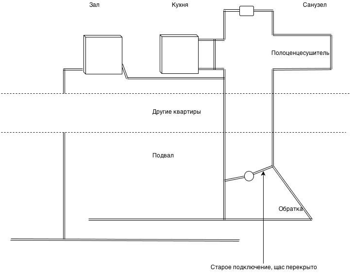 2. Щас временно сделали отвод от стояка ванной в подвале дальше в обратку (получилось что у всех кто ниже все хорошо, а у меня еле теплая в ванне и холодная батарея на кухне, то есть стояк ванны начал тоже поднимать вверх тепло, а все уходить через стояк кухни, но проблема в том что сопротивление со стороны зала ниже и все идет через низ.