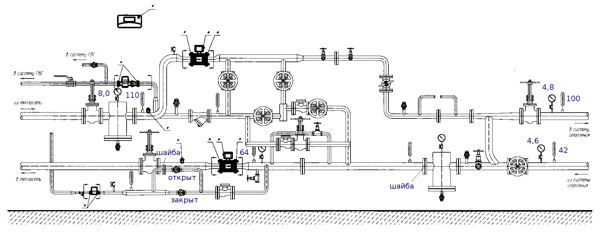 Вот схема. Возможно, что некоторого оборудования в тепловом пункте нет. То что на входе давление 8 атм., а после элеватора 4.8 атм., так это конус так работает, как я понимаю. Конус снимали и проверяли. Всё чисто.