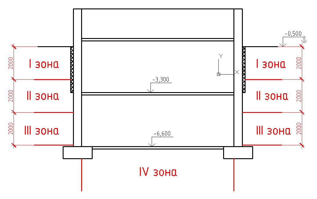 Доброго времени суток! Считаю теплопотери подземной автостоянки, заглубленной на 6 м ниже отметки планировки. Температуру внутри принимаю +5С. Вопрос возник, кто каким образом считает такие помещения? Лично я считаю обычным способом разбивки по зонам стены и пола подвала (как на прилагаемом рисунке). Но в таком случае получается, что весь пол приходится на IV зону. В СНиПе четко прописано (по крайней мере, в старом), что ВСЮ ОСТАВШУЮСЯ часть пола(стены подвала) после III зоны принимать четвертой. Не завышены ли получаются значения теплопотерь именно по полу?