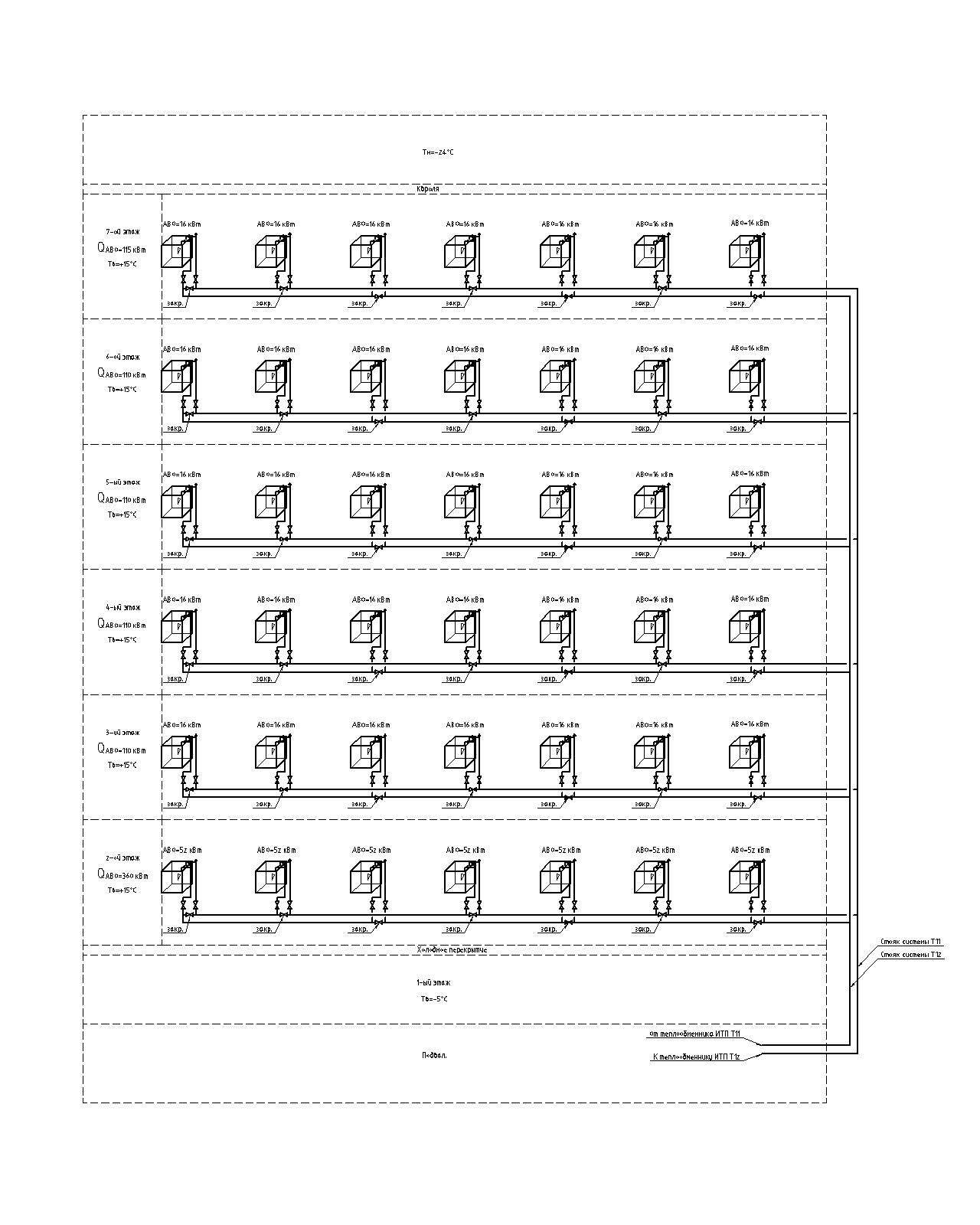 Спасибо за совет. Делать систему теплоснабжения АВО полностью параллельной очень стремно. Длина горизонтальной подающей трубы Т11 около 110 м. Заказчик желает полное отсутствие автоматики  Хочет обычные краники на ответвлениях по этажам и все. Хотя этажи исходя из нагрузок все равно придется уравнивать. Но вот увязать 7 АВОшек на одном этаже между собой с длиной подающего и обратного трубопроводов 110м при параллельном подключении.... Наверное петлей тогда уже будет намного эффективнее. По поводу подключения АВО и названия системы - Вы конечно правы, господа. Нечетные надо подрубить к обратной линии, четные к подающей. Не месте теплоносителя вообще можно чисто по трубопроводоам кататься мимо АВО. Первый раз приходиться на такие серьезные нагрузки считать систему. Насчет трех вентилей - ничего не понял. По схеме только пойму, так как чайник чайником.