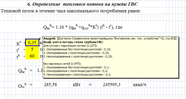 вот забавная же штука. я думал уж правда все позабыл. Пусть кто ближе к ВК поправит, как вернее расчитывать мощность Т3. Когда то давно давно разбирался, сделал расчет, в нем была вот такая формула (картинка 1) Потом расчет доделали, что то поправили, и я забрал обратно и особо не вникал уже что правильно не правильно )) а надо было бы видимо. В СНИПе по ВК вообще другая формула (картинка 2). какая же интересно правильная залез в тему с расчетами в экселе и подсмотрел у соседа )) ну тогда выходит был прав. по поводу мощностей пост 22. мы взяли процент от мощности. при этой мощности и перепаде в 65-5 мы имеем расход (общий). потом мы так же этим коэф. назначили расход циркуляции. пусть 30% от расхода ГВС. Но расход то имеет мощности в кВт такие только при перепаде в 65-5!. а по факту получается перепад пусть 65-55 (нашел в снипе, сказано на 10 считать). Т.е. теперь считаем обратно. есть расход Т4. Есть перепад. И изначальные кВт, которые мы получили процентами, обратно мы уже не получим. думал правда уже головой поехал )))