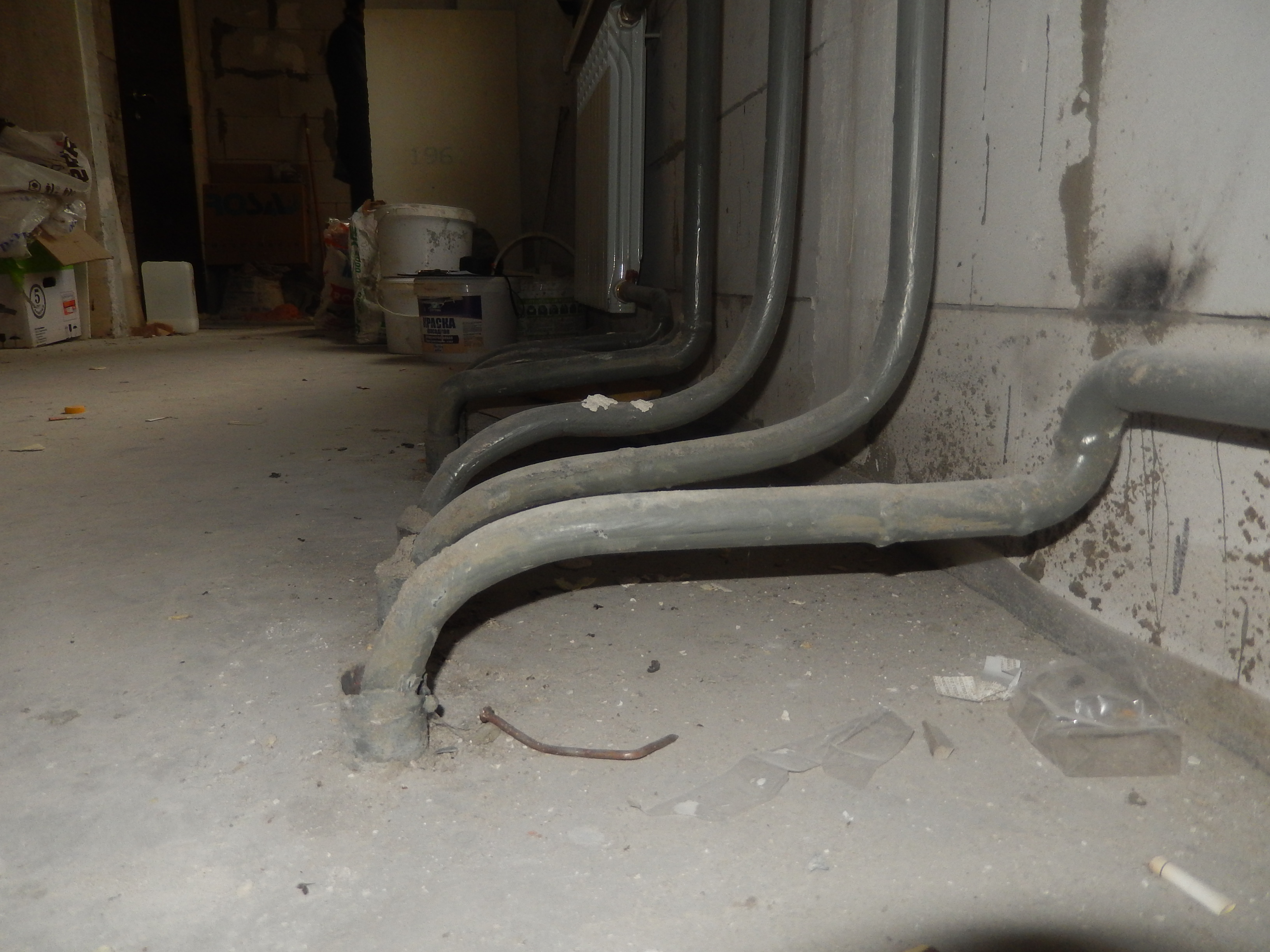 Это офисное помещение на первом этаже 10 этажного дома. Пол стяжка. Не устраивает то, что бесполезно теряется почти 2 квадрата 30 квадратного помещения. Выход стояков от подвала на 50 см от стены и на высоте почти 10 см от пола. Таким же успехом могли и на метр вывести...