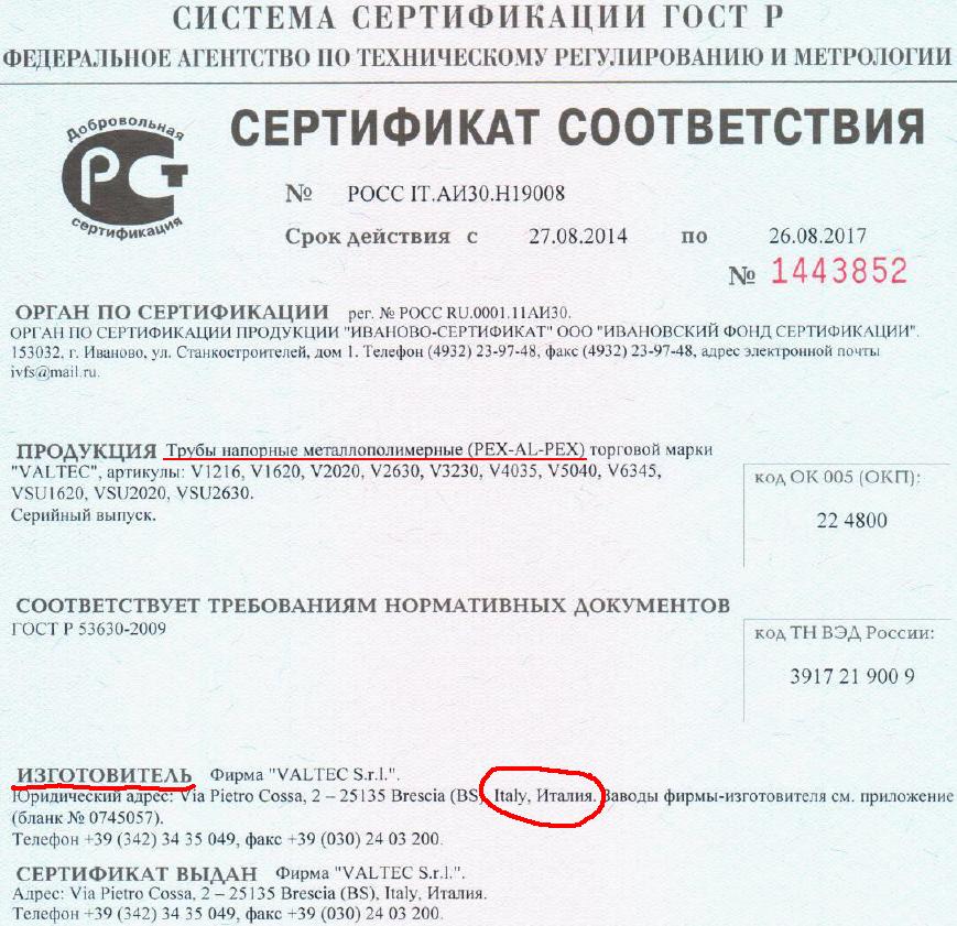 Вот прилагаю скриншот сертификата VALTEC на металлопластиковые (металлополимерные) трубы: