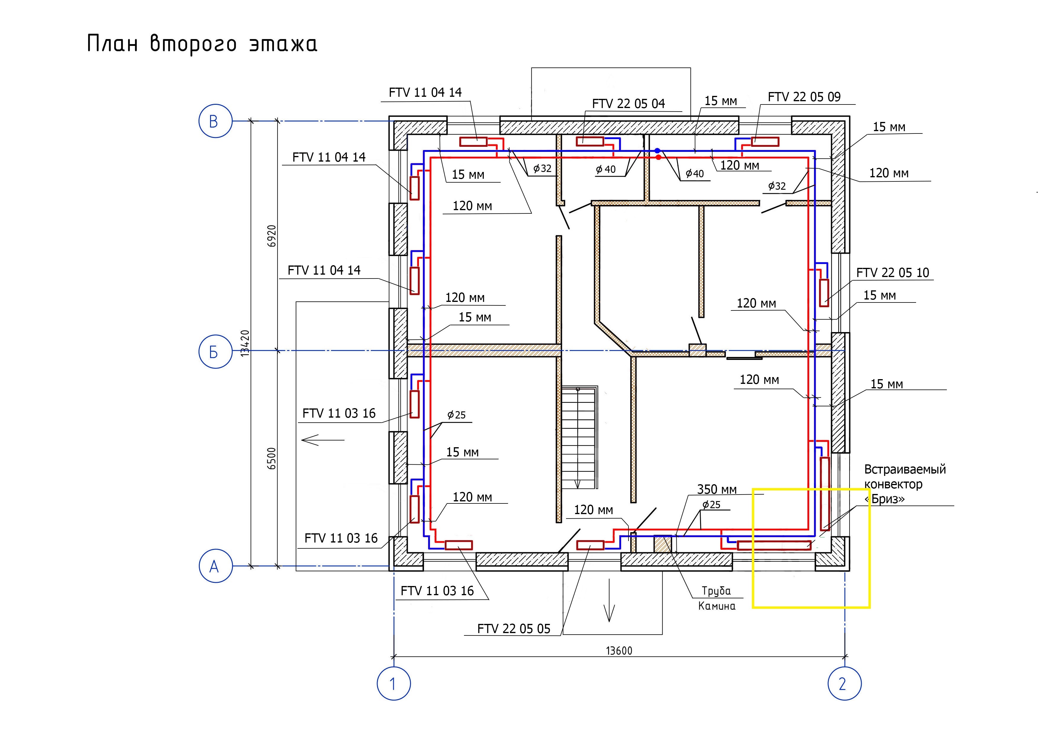 На чертеже привязка трубы к стене 15 мм, а между трубами 120 мм. Так и выполнено, трубы идут под конвекторами?