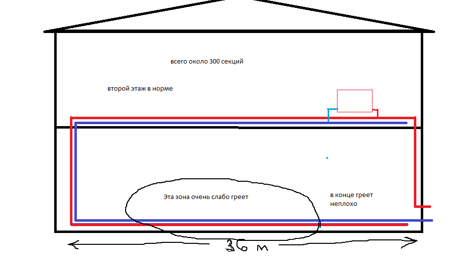 привет. Соорудили вот такую систему отопления (см картинку). Здание двухэтажное в длину 38 метров. трубы пп 50, радиаторы биметаллические. Всего секций около 300 на обоих этажах. подвод к радиатору пп 25 диаметра. в итоге второй этаж греет нормально а вот на первом очень плохо. правда к конце системы радиатора 4 греет нормально. заужение на радиаторах в следствии некачественной пайки исключаю. на подаче 70 градусов. давка системы от 1,5 до 2. Думается проблема в насосе. замена на более мощный поможет?? Подскажите. (не ругайтесь я еще можно сказать чайник в сложных расчетах. И если есть конкретное решение можно поподробнее)