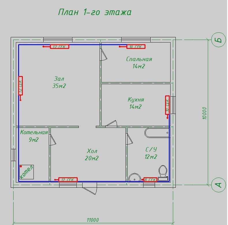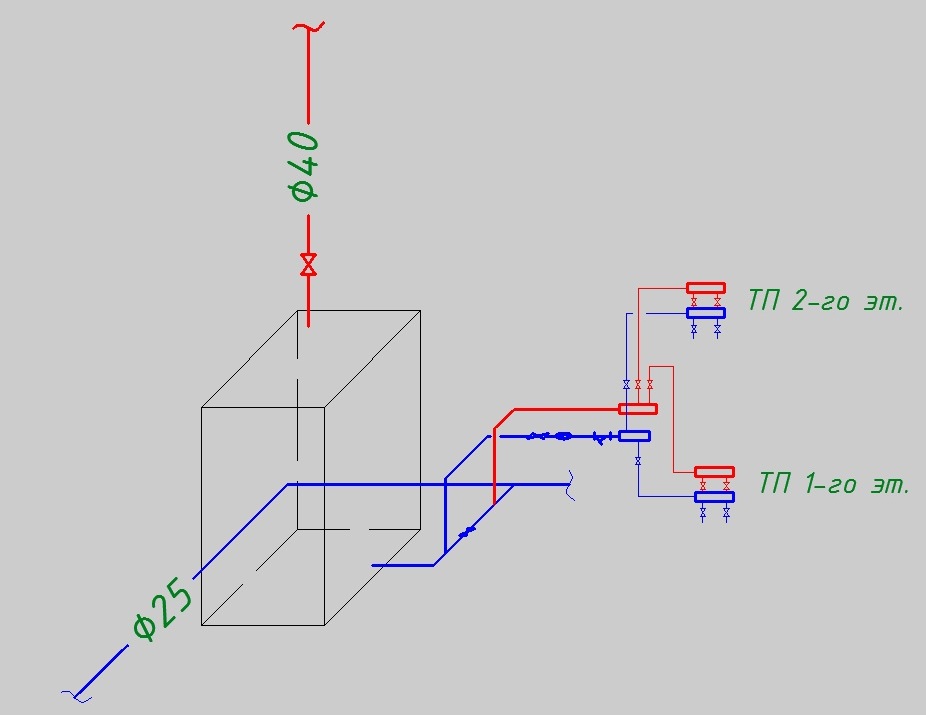 А с такой т теплоносителя сможете удержать Т поверхности пола в нормативных значениях? и потом... а зачем чугуняка, когда при таком отоплении двухсистемном обычно система с приборами обязана быть малой инерционности. т.е. туда лучше конвектора. и третье... двг ваше открывать похоже так никто и не будет и если вы хотите что б увидели вами задуманное, то размещайте в ПДФ.
