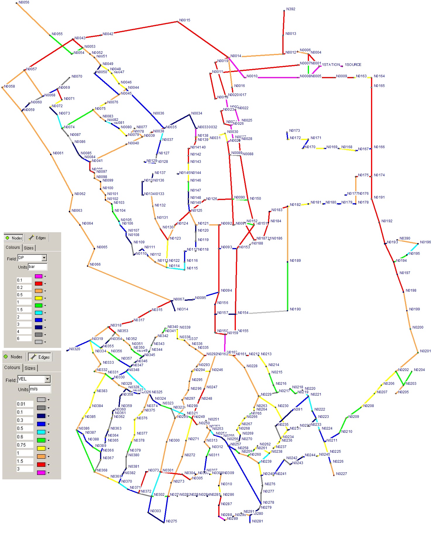 А уж всякие теплопотери и падение температуры не имеют значения. Это ничтожные величины. Единственное, с чем соглашусь, что без располагаемого перепада давления у потребителя - обеспечить нормальное теплоснабжение невозможно. Все остальное - ересь, по моим представлениям. Как программа может моделировать перетоп, если потребитель обязан регулировать съем температуры? У всех потребителей различные перепады на вводе и отличаются в несколько раз. "Маленькие" гидравлические потери на трубах - большее дросселирование на потреблении и ни о каком дополнительном расходе энергии у источника на перекачку говорить бессмысленно. Призаданном графике съема температуры на потреблении - расход один. Наличие насоса у потребителя, при соблюдении им температурного графика за счет регулирования - никак не приведет к увеличению расхода. А вот падение температуры, из практики часто приводит к необходимости завышения расхода. Более того, знаю пару объектов, у которых переразмерен диаметр трассы, приводящий к существенному падению температуры и теплоснабжающая организация вынужденно установила (сама!) байпас перед вводом, чтобы держать график. Я, к счастью, не истина в последней инстанции, просто так учили. А модель гидравлики и скорости на реальной рабочей схеме (выполненной с моим участием) выглядит примерно так. Типа - мы и сметану тоже едывали