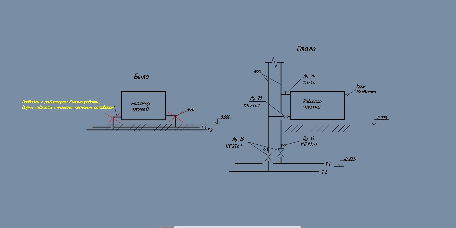Здравствуйте, помогите с видами работ и учетом деталей в спецификации Делаю реконструкцию дет.дома, бывший дет.сад на 200 мест 1974 года, никаких чертежей по ОВ нет, в тех.задании сказали чтоб радиаторы (чугунные) оставили, а поменяли только магистраль и подводки к ним. Была по видимому горизонтальная попутная система, т.к. все подводки радиаторов уходят в пол. В тех.подполье проложены магистрали, и не большое количество стояков (видимо для второй этаж) Решили делать тупиковую двухтрубку, с боковым подключением радиаторов. Прилагаю картинку Прошу помочь в учете всех видов работ и какие детали нужно будет учесть (глухие пробки, уплотнители, установка крана Маевского на чугунный радиатор и тд.) Демонтаж будет только подводок до уровня пола и заделка дыр цементно-песчаным раствором. Так же есть где подводка к радиаторам ф32, ее так же меняем на подводку ф20 ( и что для этого нужно учесть )
