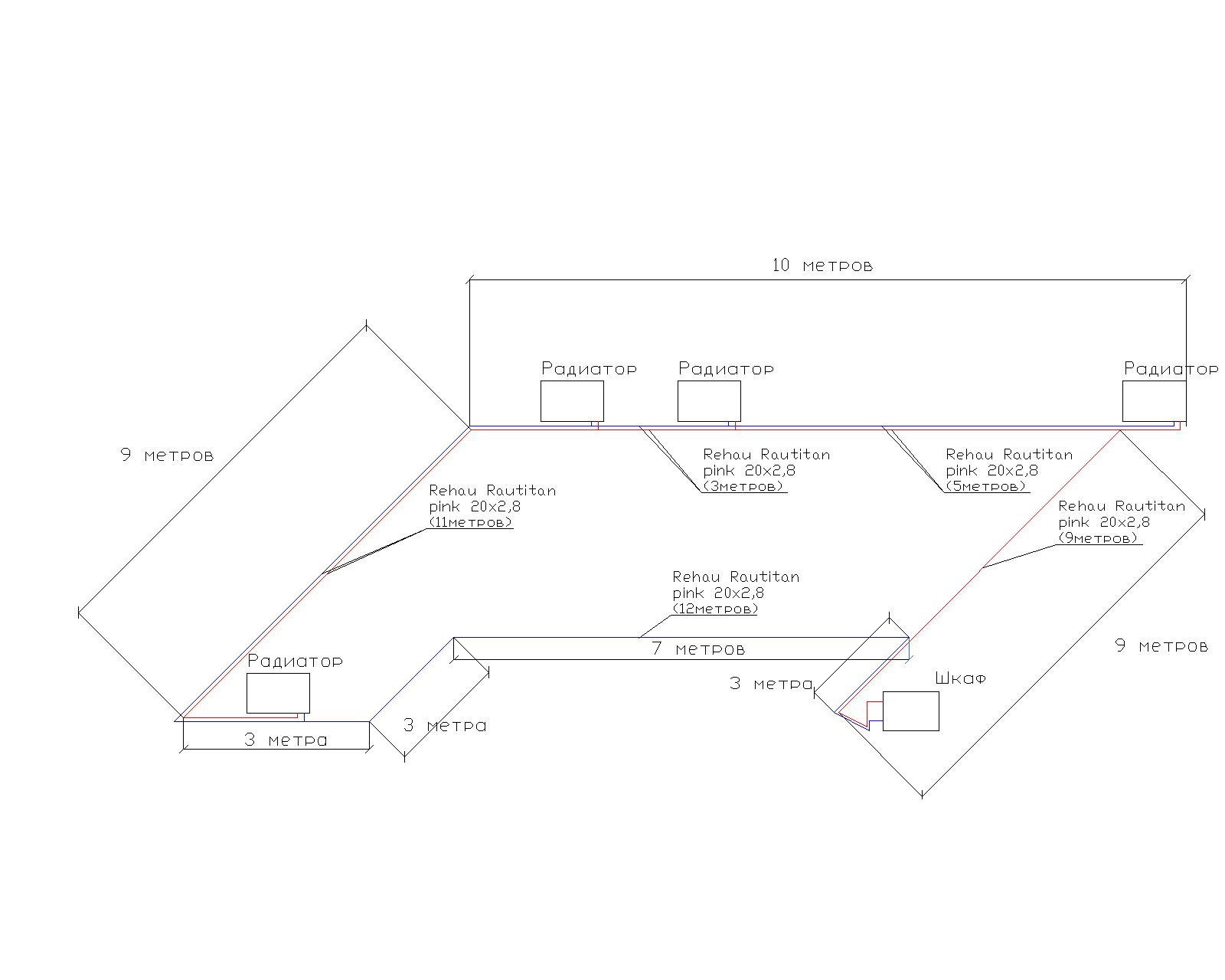 Вот прикинул как от застройщика. Труба БИР ПЕКС 20х2,8. А если коллекторная рассматривать то там получается: 1. Контур 12 метров 2. Контур 9 метров 3. Контур 14 метров 4. Контур 12 метров Все подводки к радиаторам и к шкафу, выполнены без фитингов. Плавные углы по направляющему железному углу rehau. Труба Rehau Rautitan pink 20х2,8.