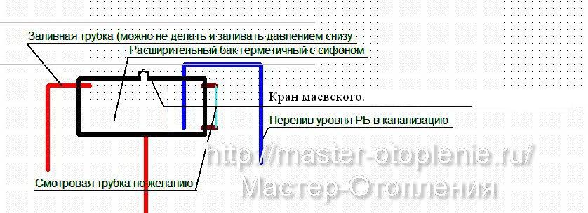 инж323, нравится мне Ваш безапеляционный тон, чесслово!  Труба эта синяя на эскизе такой формы, чтобы не было непосредственного сообщения воздушного кармана над уровнем с теплоносителем в РБ с кислородом из окружающей атмосферы, вот и всё. А кран маевского нужен и вовсе для того, чтобы, открыв его, заполнять систему через заливной патрубок, а затем его закрывают и он закрыт до след долива жидкости. Избыточное давление в баке уходит через синюю трубу в канашку, чего же тут не ясно? Можно заливать не через отдельный патрубок, а через трубу обратки? Ну конечно можно, только не удобно, если нет напорной магистрали или заливается не вода, а антифриз, к примеру. Или же вода, но подготовленная, а не водопроводное гуано. После залития кран перекрыли и всё. Канавостроитель, поясните Вашу мысль поподробнее, если не трудно, про предзакипание. Что не так в случае применения подобного РБ?