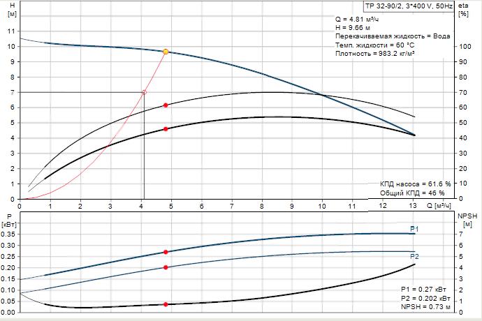 Для рабочей точки 4 м3/ч, 7 м нужно брать другой насос!!! Например TP 32-80/2 (P2 в рабочей точке - 0,142 кВт и сравнивайте его с TPE 32-90 в этой же рабочей точке) Конечно ЧП компенсирует ошибки в подборе оборудования, но считать из этого экономику ....? -