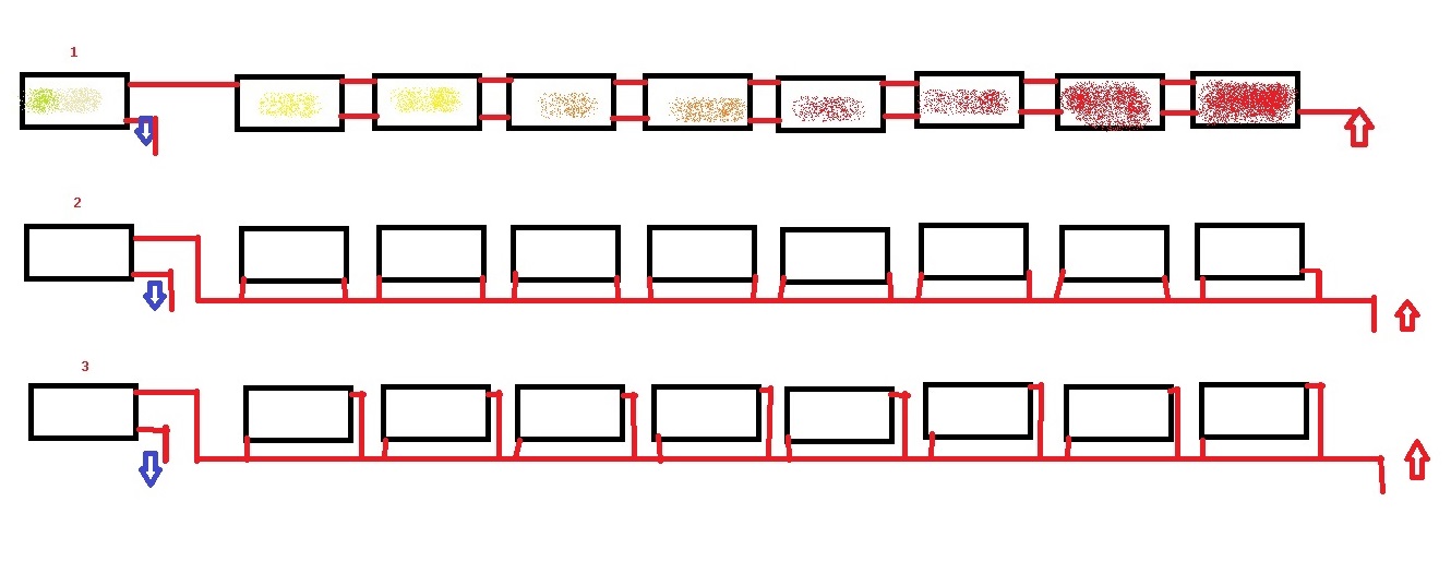 Уважаемые специалисты. Помогите пожалуйста разобраться: СПб. Школа. Спортзал. Вдоль стен батареи. Первые 2 горячие, в центре теплые, в конце где-то 36 С. Подключены по схеме 1. Панельные, стальные. Примерно 1 м каждый в длину. Все сделано трубой 3/4. Что делать-то? Зимой опускается температура в зале до 7 градусов. Прикладываю настоящую схему подключения и 2 которые, как мне кажется, могут работать эффективнее. Подскажите какая схема подключения будет работать лучше, насколько и почему?