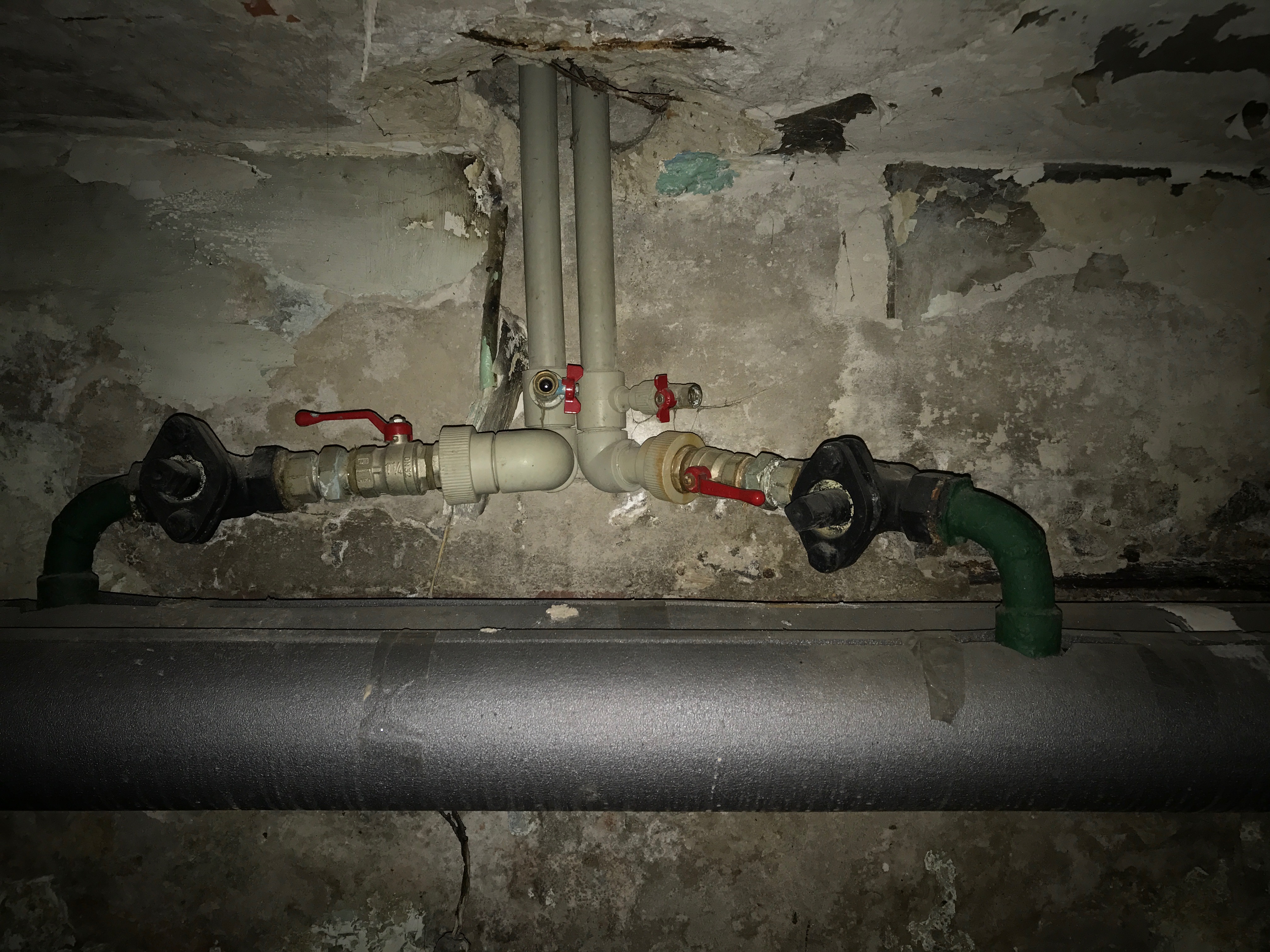 Все новенькое (все поменяно несколько лет после пожара) толстые металлические трубу разводящие подачу и обратку, от них ППР-АЛ-ППР вертикально подымается в квартиры. Диаметр пластика значительно больше чем в квартирах. Краны новые. Все трубы даже обмотаны полипропиленовой теплоизоляцией.