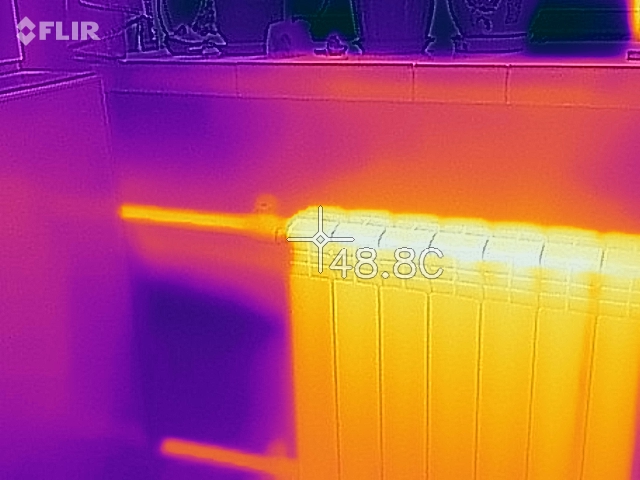 Продолжаем. По поводу. ///Напишите, какое расстояние от стояка до радиатора. 75см до леворй батареи, 85см до правой ///Какое межосевое расстояние у радиаторов? 350мм Прилагаю фото переделанного подключения Прилагаю фото на тепловизор проблемных батарей Следующим постом будут нормальные батареи в этой квартире.