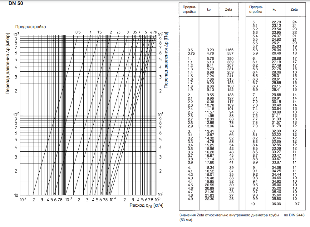 Максимальный допустимый перепад на клапане VB 2 - 10 м (по номограмме). Принимая потери в системе 2 - 3 м получим необходимое давление после клапана 4 - 4,1 кгс/см2. Соответственно перед клапаном должно быть 5 - 5,1 кгс/см2.