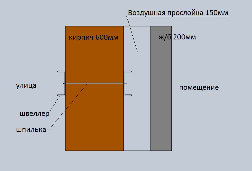 Вопрос в следующем: существует кирпичная стена, стянутая швеллерами на шпильках. Наружный швеллер впоследствии уберут, внутренний швеллер и шпилька останутся. Возводится ж/б стена на некотором расстоянии от нее (замкнутая прослойка). Данную конструкцию надо утеплить, но не снаружи.