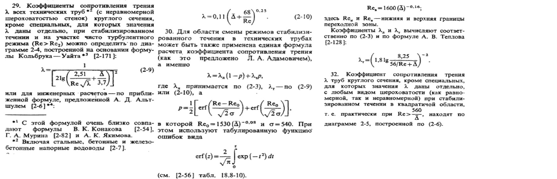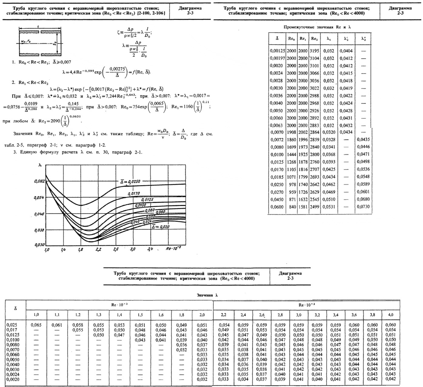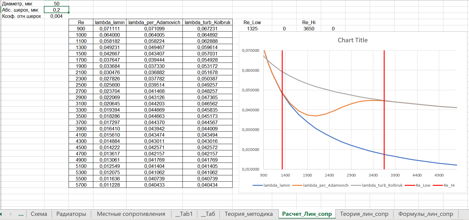 Ну и чтобы, все вышеизложенное не осталось просто пустышкой, а получило какое-то завершение Для стальных технических труб (50,40,32,25,20,16) с шероховатостью 0.2 мм (которые собственно и применяются в системах отопления с естественной циркуляцией), для того чтобы численно не решать нелинейные уранения и не расчитывать интеграл верятностей, думаю, можно коэфициент линейного сопротивления на (VBA) расчитать следующим образом: Re - критерий Рейнольдса delta - коэф. относительной шероховатости (delta = 0.2/внутр.диаметр в мм) Function lambda2(Re As Double, delta As Double) As Double Dim ReL As Double, ReR As Double lam = lambda2_0(Re, delta) If lam = 0 Then If Re < 2000 Then rez = lambda_lamin(Re) Else '----------------------- If 0.01 < delta Then 'для 16 диаметра ReL = 2600 ReR = 3500 Else 'для диаметров 20-50 ReL = 2800 ReR = 3700 '3900 End If 'rez = lambda_Kissin(Re, delta) '----------------------- If ReL < Re And Re <= ReR Then f1 = lambda2_0(ReL, delta) f2 = lambda_Teplov(ReR, delta) rez = Interpol2point(Re, ReL, ReR, f1, f2) Else If 0.006 < delta Then rez = lambda_Teplov(Re, delta) + 0.001 'моя поправка Else rez = lambda_Teplov(Re, delta) End If End If End If Else rez = lam End If lambda2 = rez End Function Function lambda2_0(Re As Double, delta As Double) As Double '--------------------------------------------- Re2 = 2090 * (1 / delta) ^ 0.0635 If delta <= 0.007 Then Re0 = 2000 Re1 = 2000 la_zv = 0.032 la2 = 7.242 * Re2 ^ (-0.643) Else 'delta > 0.007 Re0 = 754 * Exp(0.0065 / delta) Re1 = 1160 * (1 / delta) ^ 0.11 la_zv = 0.0758 - 0.0109 / (delta ^ 0.286) la2 = 0.145 / (delta ^ -0.244) End If '--------------------------------------------- If Re0 <= Re And Re < Re1 Then If 0.007 <= delta Then lambda2_0 = 4.4 * (Re ^ (-0.595)) * Exp(-(0.00275 / delta)) End If End If If Re1 <= Re And Re <= Re2 Then lambda2_0 = la_zv + (la2 - la_zv) * Exp(-(0.0017 * (Re2 - Re)) ^ 2) End If End Function Function lambda_Teplov(ByVal Re As Double, ByVal delta As Double) As Double lambda_Teplov = 1 / ((1.8 * Lg(8.25 / (delta + 56 / Re))) ^ 2) End Function Границы зон также видны из графиков. Все подробности с расчетами в файле.