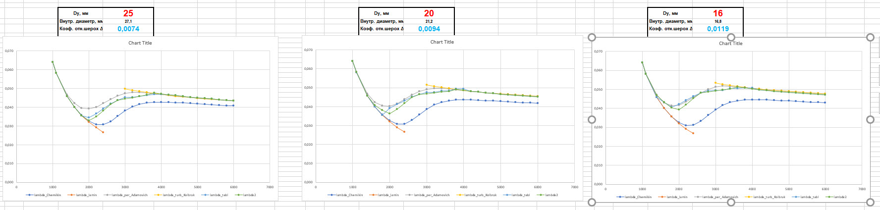 Юрий_Нд, вы меня тролите или действительно не понимаете?  Хорошо, пока нет еще достаточных оснований предпологать первое, предположим второе. Все формулы есть в файле, если его открывали, то незаметить их сложно, ну да ладно приведу явно. Уравнение Кольбрука - не имеет аналитического решения. Решить его можно только численно. Что это такое и как это сделать объяснять не буду (в файле это есть,я это сделал), скажу только, что если есть возможность избежать данной процедуры - то лучше избежать. Но возникает вопрос чем его заменить. Чтобы было понятно картинки приложил. Как видно для больших диаметров - Теплов очень неплохол совпадает с Кольбруком. А вот на маленьких (20-16) бЯда..., так и просится немного вверх его приподнять, что я собственно и сделал в функции, код которой приведен выше. Про метод последовательных приближений, честно говоря, не понял. Нет, что это такое - я, в общих чертах, знаю, и, даже иногда приходится применять, но вот что, здесь, и, главное куда, "последовательно приближать", для меня, пока, остается загадкой.