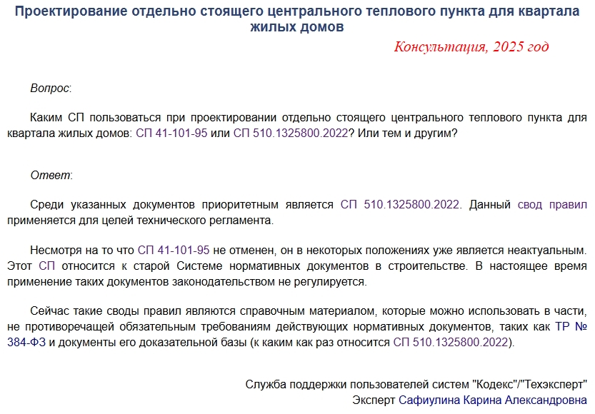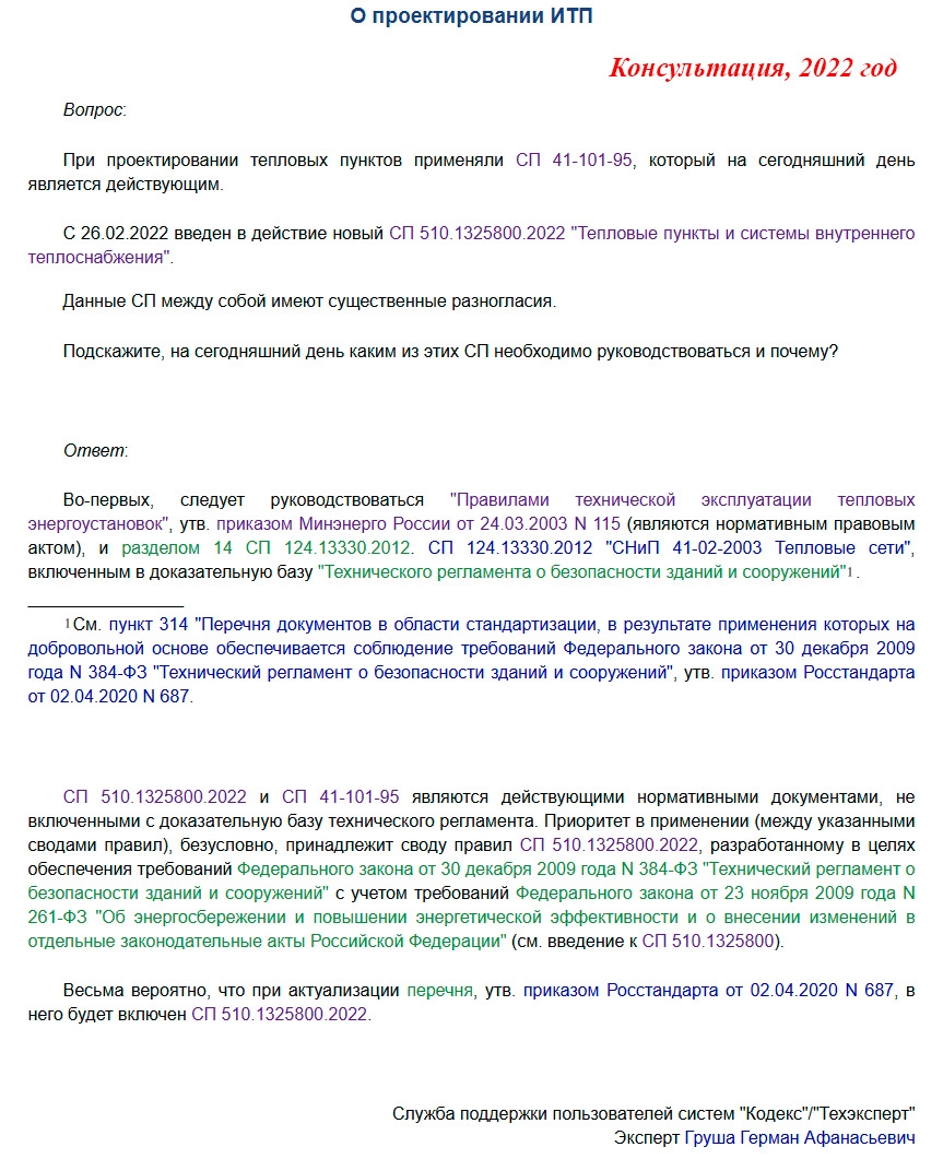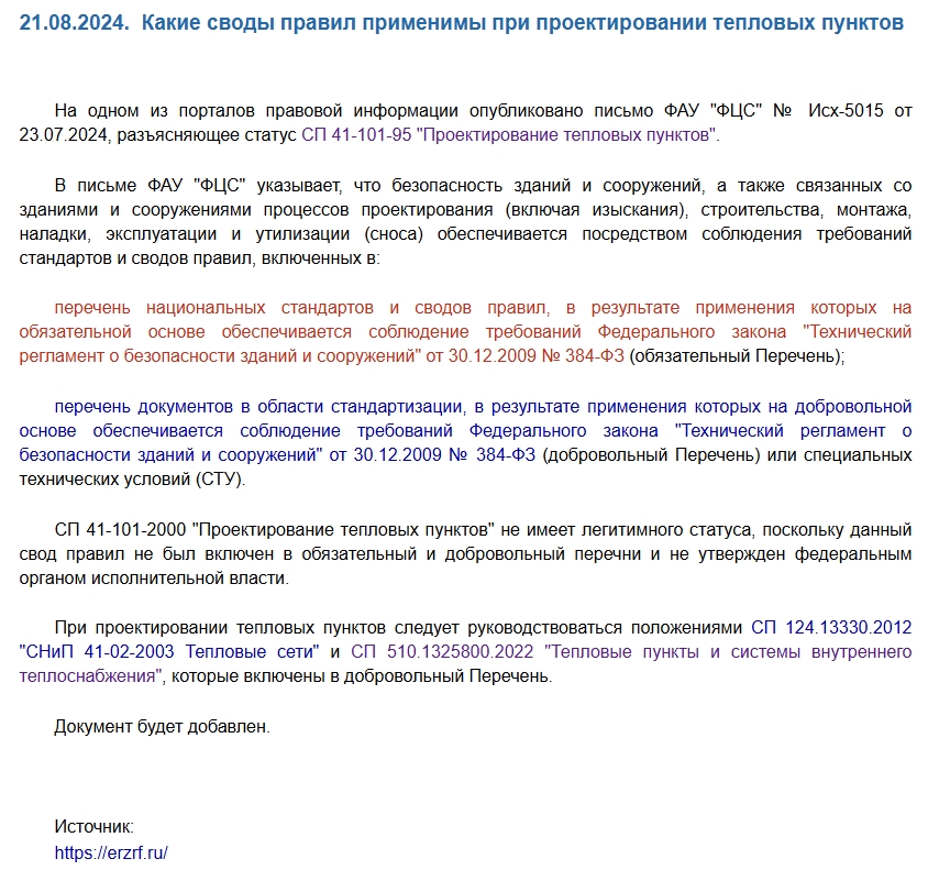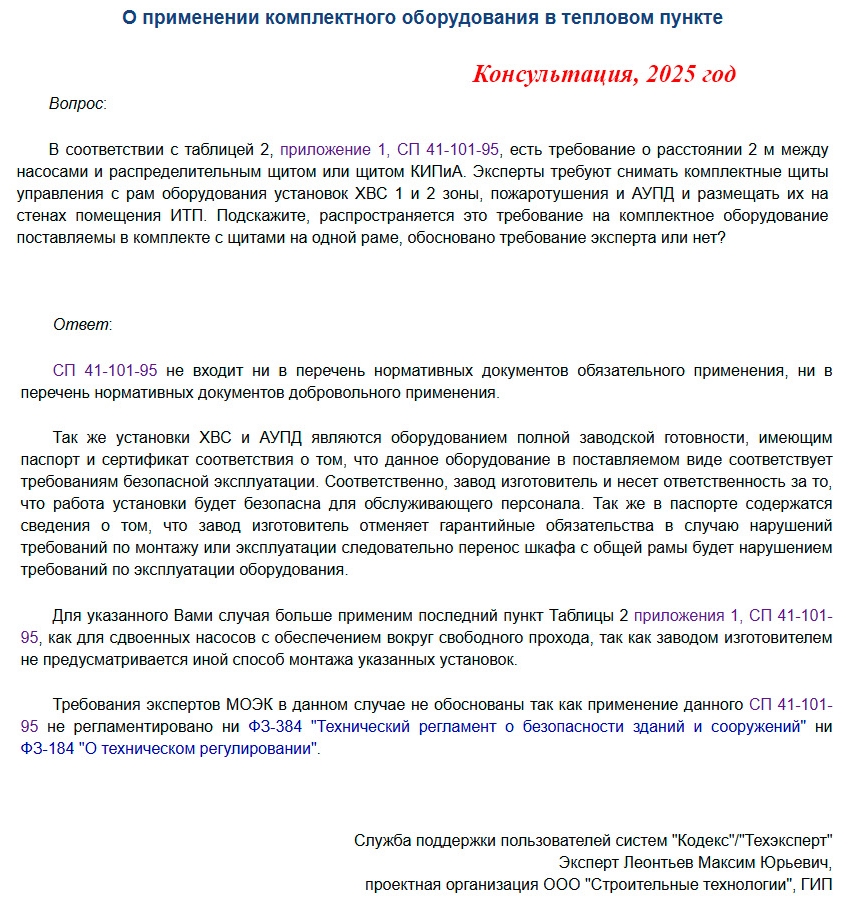 Цитата(ИОВ @ 29.4.2020, 14:04)  СП 41-101-95 вообще не является документом по стандартизации, т.к. не проходил утверждёния в соответствии со ст. 22 № 162-ФЗ. Поэтому этот СП не может входить в Перечни нормативных документов, ни в обязательный, ни в добровольный. Но в п. 14.2 СП 124 дана прямая ссылка на СП 41-101-95. В ТУ, как правило, требуют выполнения проекта в соответствии с действующими нормативными документами - таким документом является СП 124. Так что, получается, опосредованно, проектировщик должен выполнять указания СП 41-101-95. Времени с момента обсуждения прошло много, но вопрос остается актуальным. Пункт 14.2 СП 124.13330.2012: "(...) Требования к объемно-планировочным и конструктивным решениям помещений тепловых пунктов приведены в [СП 41-101-95]." (в ред. Изменения N 1, утв. Приказом Минстроя России от 20.11.2019 N 698/пр, Изменения N 2, утв. Приказом Минстроя России от 27.12.2021 N 1021/пр)В части требований к объемно-планировочным и конструктивным решениям помещений тепловых пунктов [но не всех, а тех, на которые распространяется СП 124.13330.2012 - классифицируемых как сооружения на тепловых сетях и находящихся на балансе теплоснабжающей (теплосетевой) компании] СП 41-101-95 действует. Минстрой в своем письме от 01.42025 г. N 8781-ОГ/08 «О применении СП 41-101-95» об этом забыл.