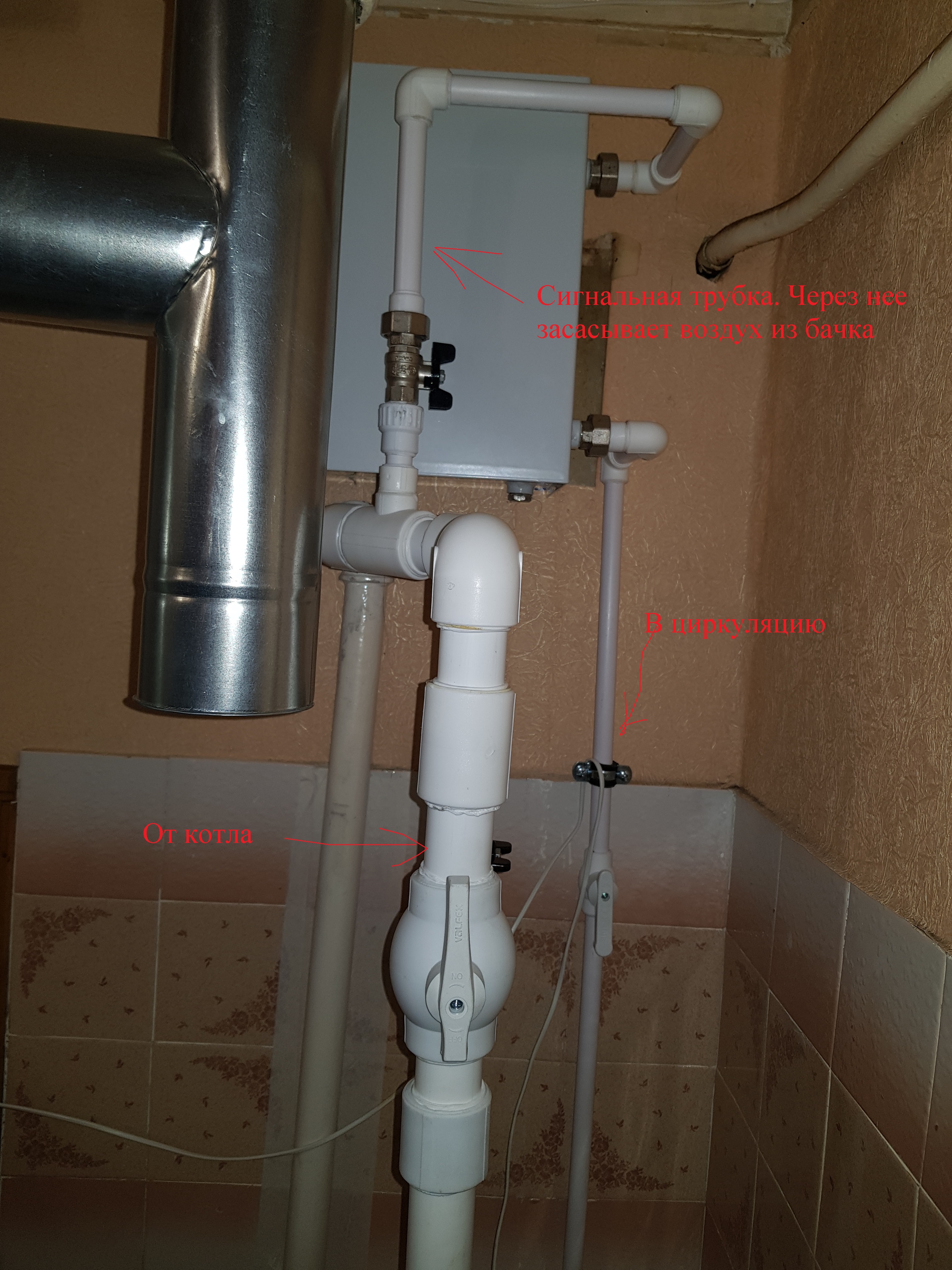 Система отопления с открытым бачком, Всасывает воздух после котла через сигнальную трубку |